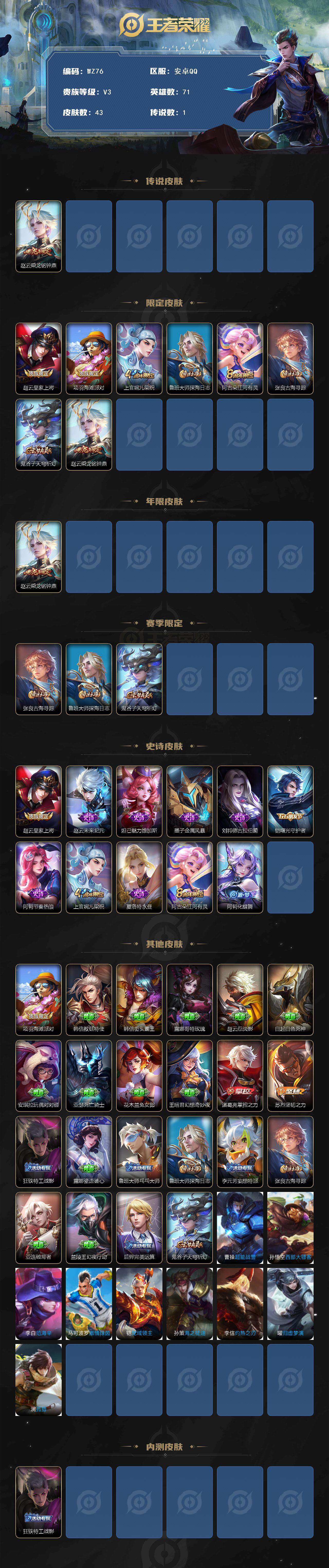 - PX_2081161-贵族等级: V6 英雄数: 52 皮肤数: 47 传说皮: 地狱火,澜逐花归海 限定皮: 朱雀志,大圣娶亲