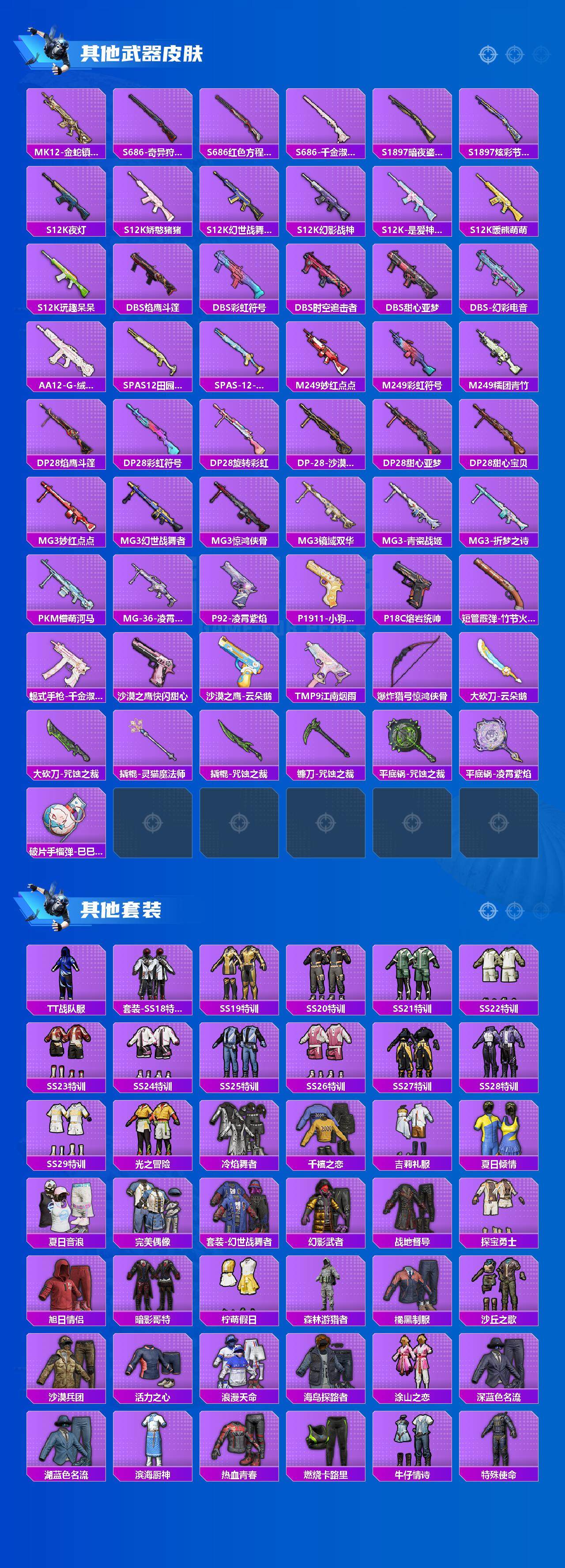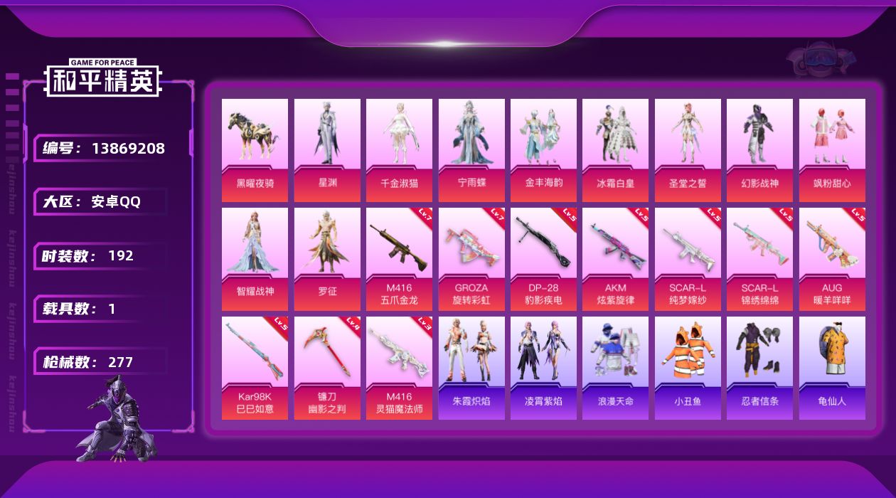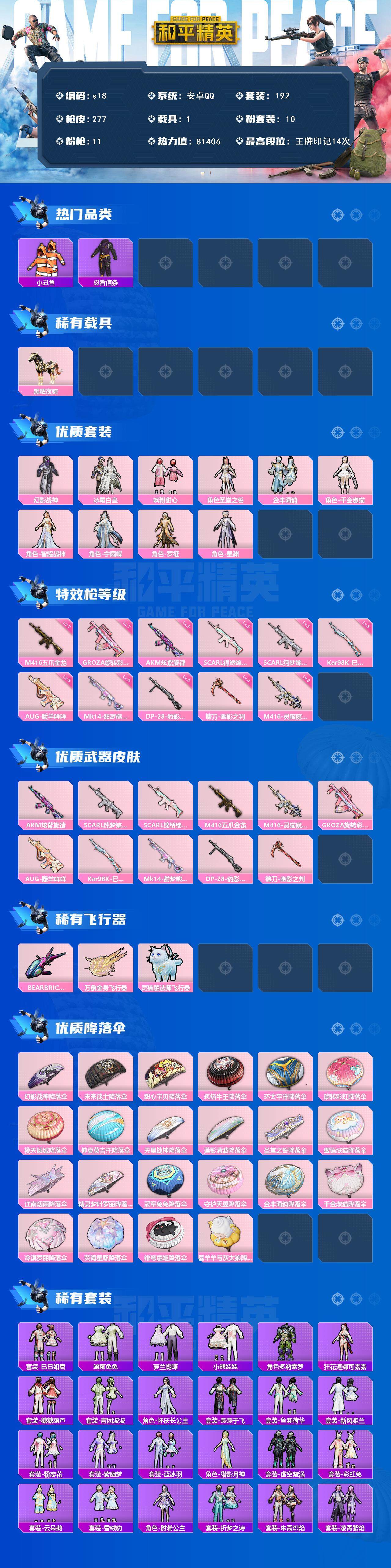 [13869208]安卓 手Q-10粉装-11特效枪-1载具-4粉色飞行器-81406热力值-14王牌印记-192套装-277枪皮 【热门品类】:套装-浪漫天命,套装-小丑鱼,套装-沙漠守护者,套装-忍者信条,套装-龟仙人,套装-暗影哥特,角色-8号机,角色-Mark.06 【粉色载具】:黑曜夜骑 【粉色套装】:粉装-幻影战神,粉装-冰霜白皇,粉装-飒粉甜心,角色-圣堂之誓,粉装-金丰海韵,角色-千金淑猫,角色-智耀战神,角色-宁雨蝶,角色-罗征,角色-星渊 【粉色枪皮等级】:AKM-炫紫旋律(五级),SCAR-L-纯梦嫁纱(五级),SCAR-L-锦绣绵绵(五级),M416-五爪金龙(七级),M416-灵猫魔法师(三级),GROZA-旋转彩虹(七级),AUG-暖羊咩咩(五级),Kar98K-巳巳如意(五级),Mk14-甜梦熊击(五级),DP-28-豹影疾电(五级),镰刀-幽影之判(四级) 【粉色枪皮】:AKM-炫紫旋律,SCAR-L-纯梦嫁纱,SCAR-L-锦绣绵绵,M416-五爪金龙,M416-灵猫魔法师,GROZA-旋转彩虹,AUG-暖羊咩咩,Kar98K-巳巳如意,Mk14-甜梦熊击,DP-28-豹影疾电,镰刀-幽影之判 【粉色飞行器】:BEARBRICK飞行器,万象金身飞行器,灵猫魔法师飞行器 【粉色降落伞】:幻影战神降落伞,未来战士降落伞,甜心宝贝降落伞,炙焰牛王降落伞,环太平洋降落伞,旋转彩虹降落伞,桃夭倾城降落伞,仲夏莫吉托降落伞,天星战神降落伞,莲影清波降落伞,圣堂之誓降落伞,蜜语绒猫降落伞,江南烟雨降落伞,精灵梦叶罗丽降落伞,冠军兔兔降落伞,守护天翼降落伞,金丰海韵降落伞,千金淑猫降落伞,冷漠罗丽降落伞,荧海星豚降落伞,绯穹魔姬降落伞,喜羊羊与灰太狼降落伞 【稀有套装】:套装-龟仙人,套装-巳巳如意,套装-雏菊兔兔,套装-萝兰蝴蝶,套装-小熊娃娃,角色-多纳泰罗,角色-狂花道·娜可露露,套装-糖糖葫芦,套装-青团波波,角色-怀庆长公主,套装-燕燕于飞,套装-鱼渊荷华,套装-新风雅兰,套装-粉恋花,套装-紫幽梦,套装-蓝冰羽,角色-猎影月神,套装-虚空漩涡,套装-彩虹兔,套装-云朵鹅,套装-雪绒豹,角色-时希公主,套装-折梦之诗,套装-朱霞炽焰,套装-凌霄紫焰 【稀有枪皮】:AKM-墨染幽兰,AKM-彩虹符号,AKM-沙漠守护者,AKM-百万伏特,AKM-破晓战魂,A