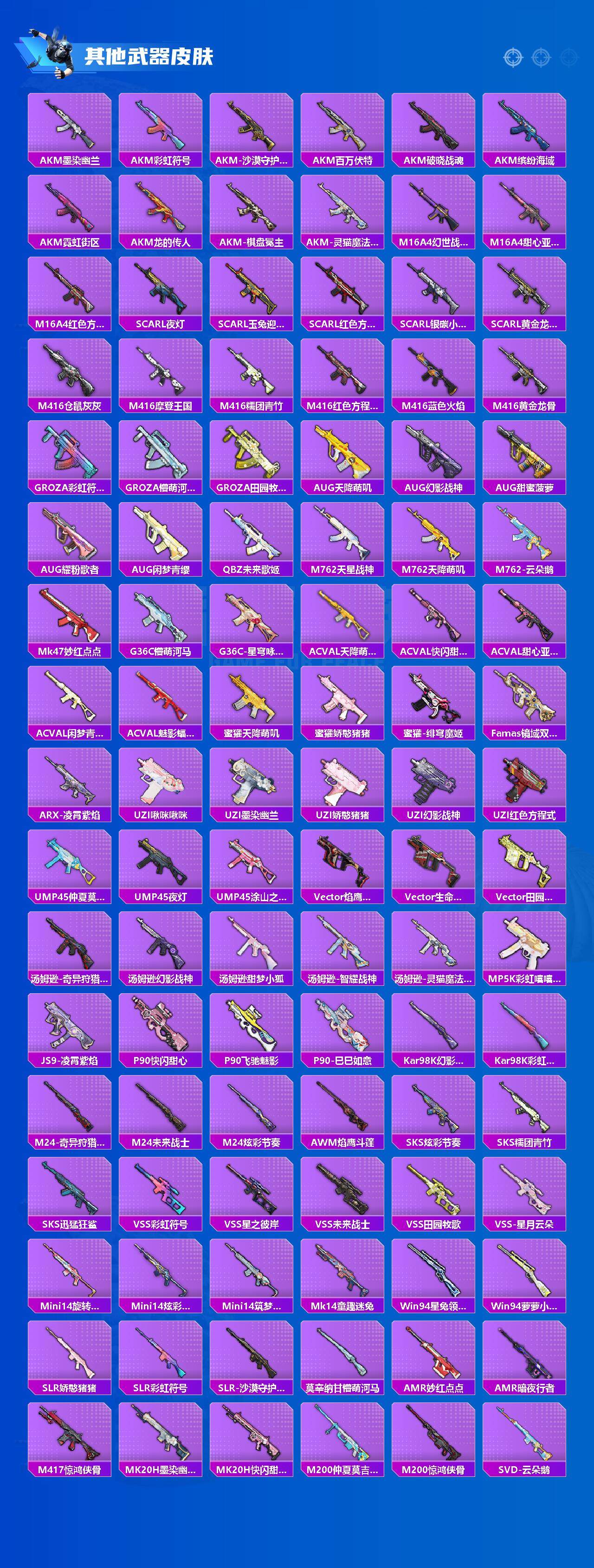 AKM-炫紫旋律,SCAR-L-纯梦嫁纱,M416-五爪金龙,GROZA-旋转彩虹,AUG-暖羊咩咩,Kar98K-巳巳如意