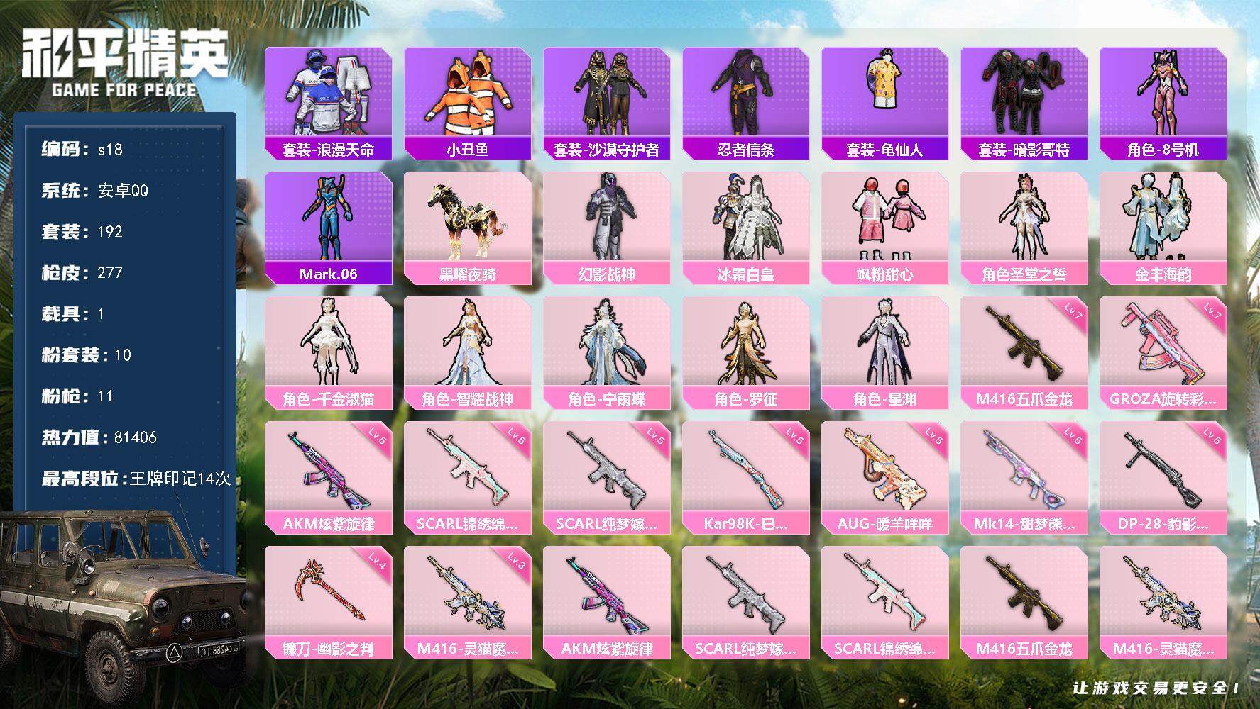 [13869208]安卓 手Q-10粉装-11特效枪-1载具-4粉色飞行器-81406热力值-14王牌印记-192套装-277枪皮