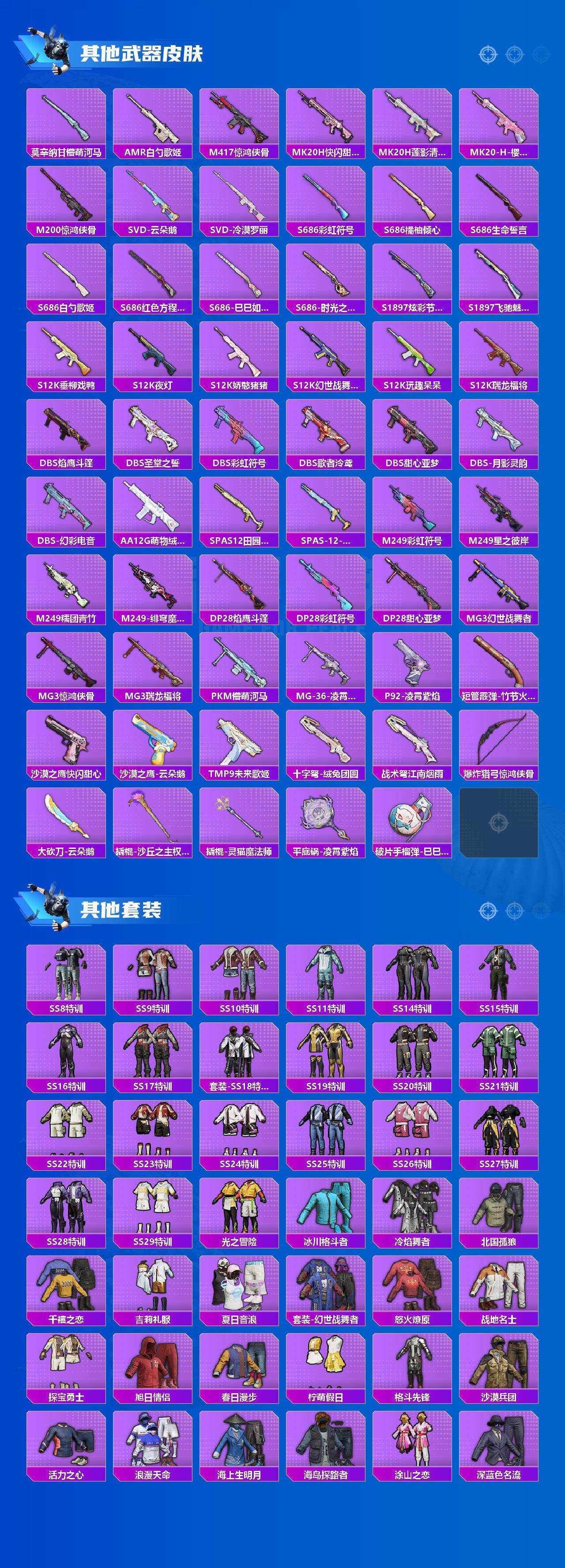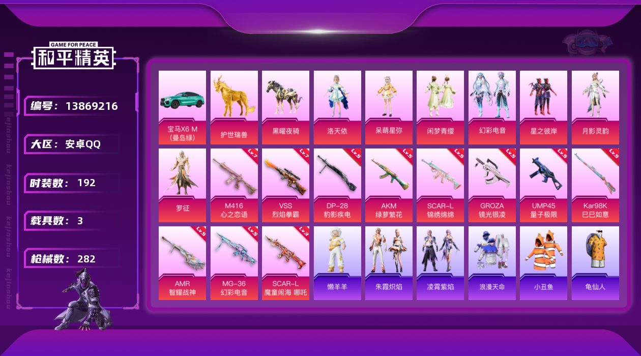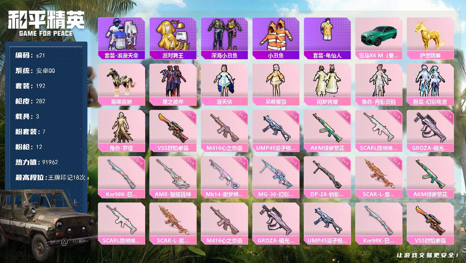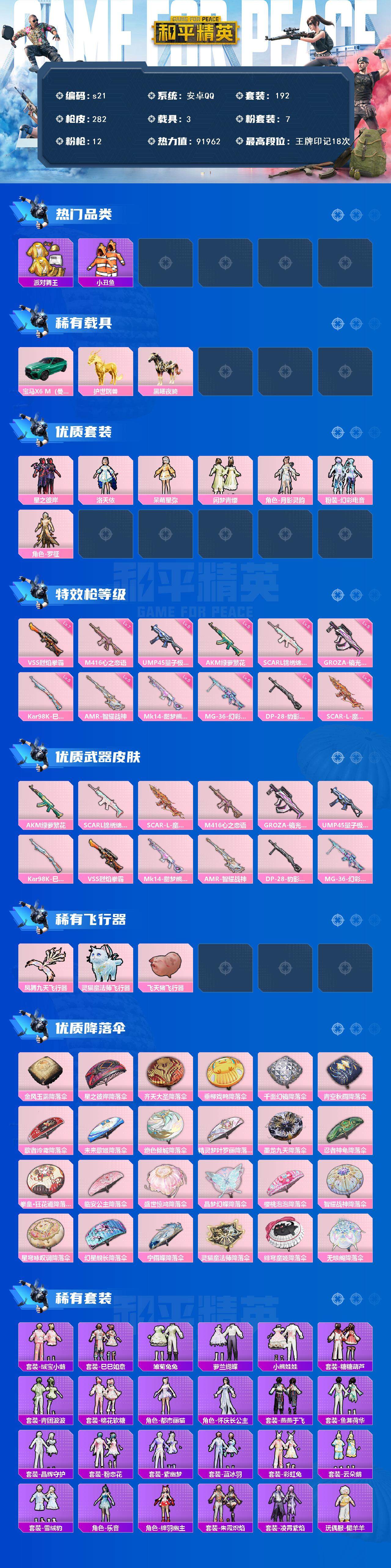 [13869216]安卓 手Q-7粉装-12特效枪-3载具-3粉色飞行器-91962热力值-18王牌印记-192套装-282枪皮 【热门品类】:套装-浪漫天命,套装-派对舞王,套装-深海小丑鱼,套装-小丑鱼,套装-龟仙人 【粉色载具】:宝马X6 M(曼岛绿),护世瑞兽,黑曜夜骑 【粉色套装】:粉装-星之彼岸,角色-洛天依,角色-呆萌星弥,粉装-闲梦青缨,角色-月影灵韵,粉装-幻彩电音,角色-罗征 【粉色枪皮等级】:AKM-绿萝繁花(五级),SCAR-L-锦绣绵绵(五级),SCAR-L-魔童闹海 哪吒(三级),M416-心之恋语(七级),GROZA-镜光银凌(五级),UMP45-量子极限(五级),Kar98K-巳巳如意(五级),VSS-烈焰拳霸(七级),Mk14-甜梦熊击(五级),AMR-智耀战神(五级),DP-28-豹影疾电(五级),MG-36-幻彩电音(五级) 【粉色枪皮】:AKM-绿萝繁花,SCAR-L-锦绣绵绵,SCAR-L-魔童闹海 哪吒,M416-心之恋语,GROZA-镜光银凌,UMP45-量子极限,Kar98K-巳巳如意,VSS-烈焰拳霸,Mk14-甜梦熊击,AMR-智耀战神,DP-28-豹影疾电,MG-36-幻彩电音 【粉色飞行器】:凤舞九天飞行器,灵猫魔法师飞行器,飞天猪飞行器 【粉色降落伞】:金风玉露降落伞,星之彼岸降落伞,齐天大圣降落伞,垂柳戏鸭降落伞,千面幻镜降落伞,青空秋雨降落伞,歌者泠鸢降落伞,未来歌姬降落伞,绝色倾城降落伞,精灵梦叶罗丽降落伞,墨龙九天降落伞,忍者神龟降落伞,拳皇·狂花道降落伞,临安公主降落伞,盛世惊鸿降落伞,晶梦幻蝶降落伞,樱桃泡泡降落伞,智耀战神降落伞,星穹咏叹调降落伞,幻星舰长降落伞,宁雨蝶降落伞,灵猫魔法师降落伞,绯穹魔姬降落伞,无垠阁降落伞 【稀有套装】:套装-龟仙人,套装-绒宝小鹅,套装-巳巳如意,套装-雏菊兔兔,套装-萝兰蝴蝶,套装-小熊娃娃,套装-糖糖葫芦,套装-青团波波,套装-棉花软糖,角色-都市丽猫,角色-怀庆长公主,套装-燕燕于飞,套装-鱼渊荷华,套装-晶辉守护,套装-粉恋花,套装-紫幽梦,套装-蓝冰羽,套装-彩虹兔,套装-云朵鹅,套装-雪绒豹,角色-乐音,角色-绛羽幽主,套装-朱霞炽焰,套装-凌霄紫焰,玩偶服-懒羊羊 【稀有枪皮】:AKM-夜灯,AKM-彩虹符号,AKM-星之彼岸,AKM-灼热熔岩,AKM-生命誓言,