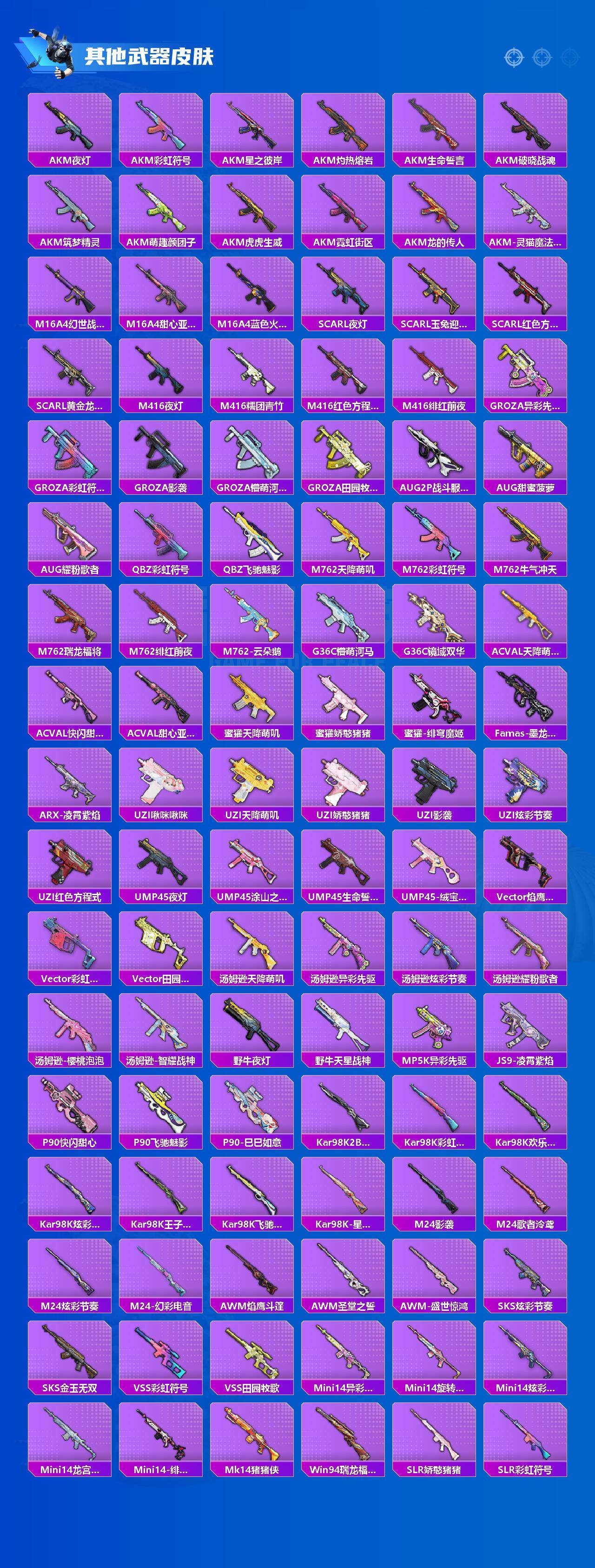 【粉色枪皮】:AKM-绿萝繁花,SCAR-L-锦绣绵绵,SCAR-L-魔童闹海 哪吒,M416-心之恋语,GROZA-镜光银凌,UMP45-量子极限,Kar98K-巳巳如意,VSS-烈焰拳霸,Mk14-甜梦熊击,AMR-智耀战神,DP-28-豹影疾电,MG-36-幻彩电音