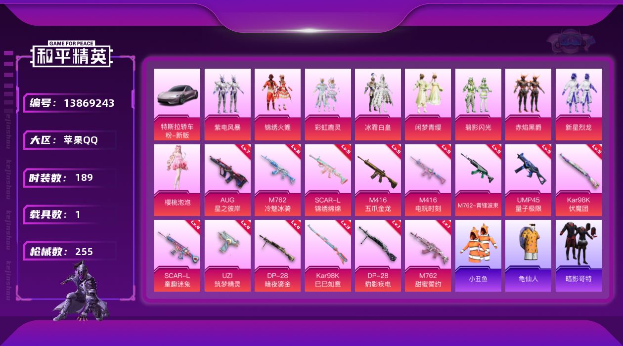 [13869243]苹果 手Q-9粉装-14特效枪-1载具-2粉色飞行器-85757热力值-9王牌印记-189套装-255枪皮