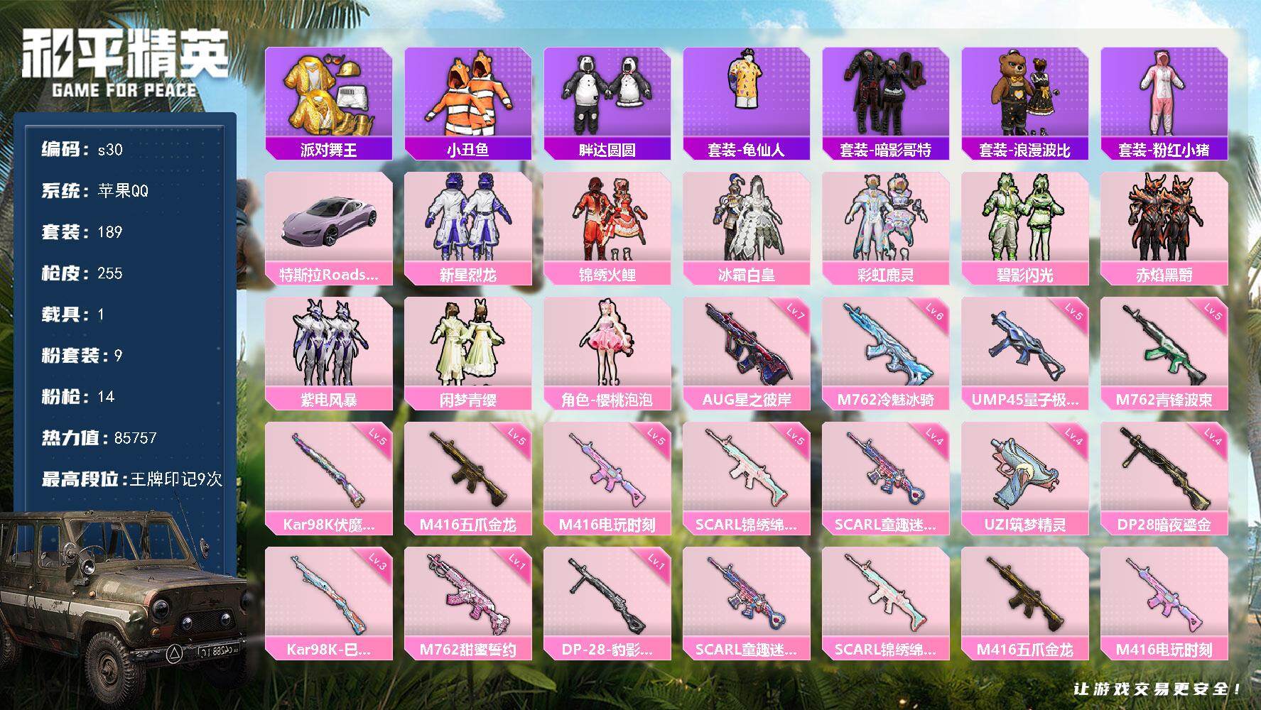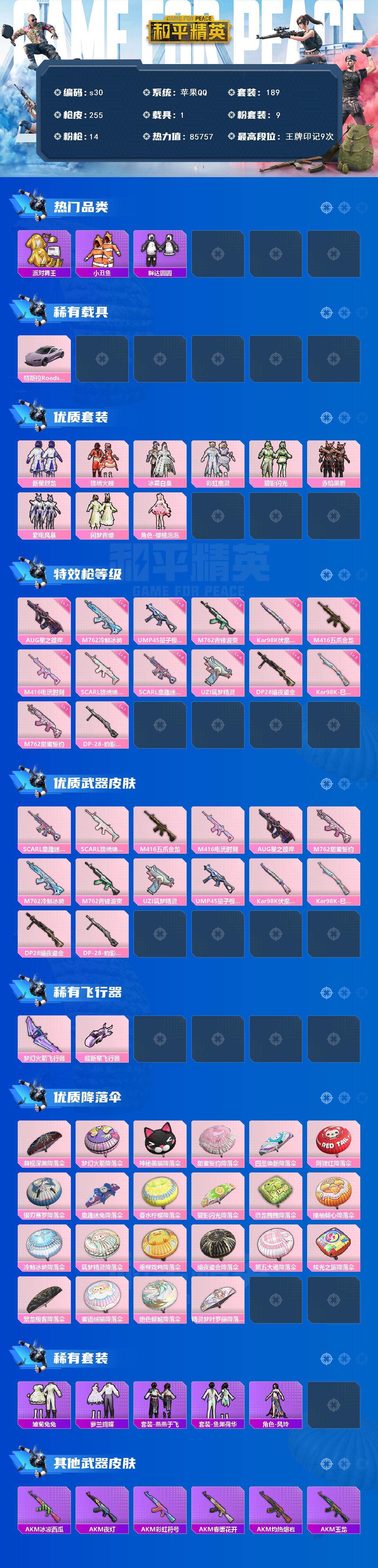[13869243]苹果 手Q-9粉装-14特效枪-1载具-2粉色飞行器-85757热力值-9王牌印记-189套装-255枪皮 【热门品类】:套装-派对舞王,套装-小丑鱼,套装-胖达圆圆,套装-龟仙人,套装-暗影哥特,套装-浪漫波比,套装-粉红小猪 【粉色载具】:特斯拉Roadster(沁心粉) 【粉色套装】:粉装-新星烈龙,粉装-锦绣火鲤,粉装-冰霜白皇,粉装-彩虹鹿灵,粉装-碧影闪光,粉装-赤焰黑爵,粉装-紫电风暴,粉装-闲梦青缨,角色-樱桃泡泡 【粉色枪皮等级】:SCAR-L-童趣迷兔(四级),SCAR-L-锦绣绵绵(五级),M416-五爪金龙(五级),M416-电玩时刻(五级),AUG-星之彼岸(七级),M762-甜蜜誓约(一级),M762-冷魅冰骑(六级),M762-青锋波束(五级),UZI-筑梦精灵(四级),UMP45-量子极限(五级),Kar98K-伏魔团(五级),Kar98K-巳巳如意(三级),DP-28-暗夜鎏金(四级),DP-28-豹影疾电(一级) 【粉色枪皮】:SCAR-L-童趣迷兔,SCAR-L-锦绣绵绵,M416-五爪金龙,M416-电玩时刻,AUG-星之彼岸,M762-甜蜜誓约,M762-冷魅冰骑,M762-青锋波束,UZI-筑梦精灵,UMP45-量子极限,Kar98K-伏魔团,Kar98K-巳巳如意,DP-28-暗夜鎏金,DP-28-豹影疾电 【粉色飞行器】:梦幻火箭飞行器,超新星飞行器 【粉色降落伞】:凝视深渊降落伞,梦幻火箭降落伞,神秘黑猫降落伞,甜蜜誓约降落伞,四圣焕新降落伞,阿狸红降落伞,银刃赛罗降落伞,童趣迷兔降落伞,香水柠檬降落伞,碧影闪光降落伞,恐龙拽拽降落伞,橘柚倾心降落伞,冷魅冰骑降落伞,筑梦精灵降落伞,垂柳戏鸭降落伞,暗夜鎏金降落伞,第五大道降落伞,炫光之旅降落伞,繁龙极客降落伞,蜜语绒猫降落伞,绝色倾城降落伞,精灵梦叶罗丽降落伞 【稀有套装】:套装-龟仙人,套装-雏菊兔兔,套装-萝兰蝴蝶,套装-燕燕于飞,套装-鱼渊荷华,角色-风玲 【稀有枪皮】:AKM-冰凉西瓜,AKM-夜灯,AKM-彩虹符号,AKM-春暖花开,AKM-灼热熔岩,AKM-玉龙,AKM-筑梦精灵,AKM-萌趣颜团子,AKM-锦绣火鲤,AKM-霓虹街区,AKM-龙的传人,M16A4-幻世战舞者,M16A4-机械英豪,M16A4-甜心亚梦,SCAR-L-炫彩节奏,SCAR
