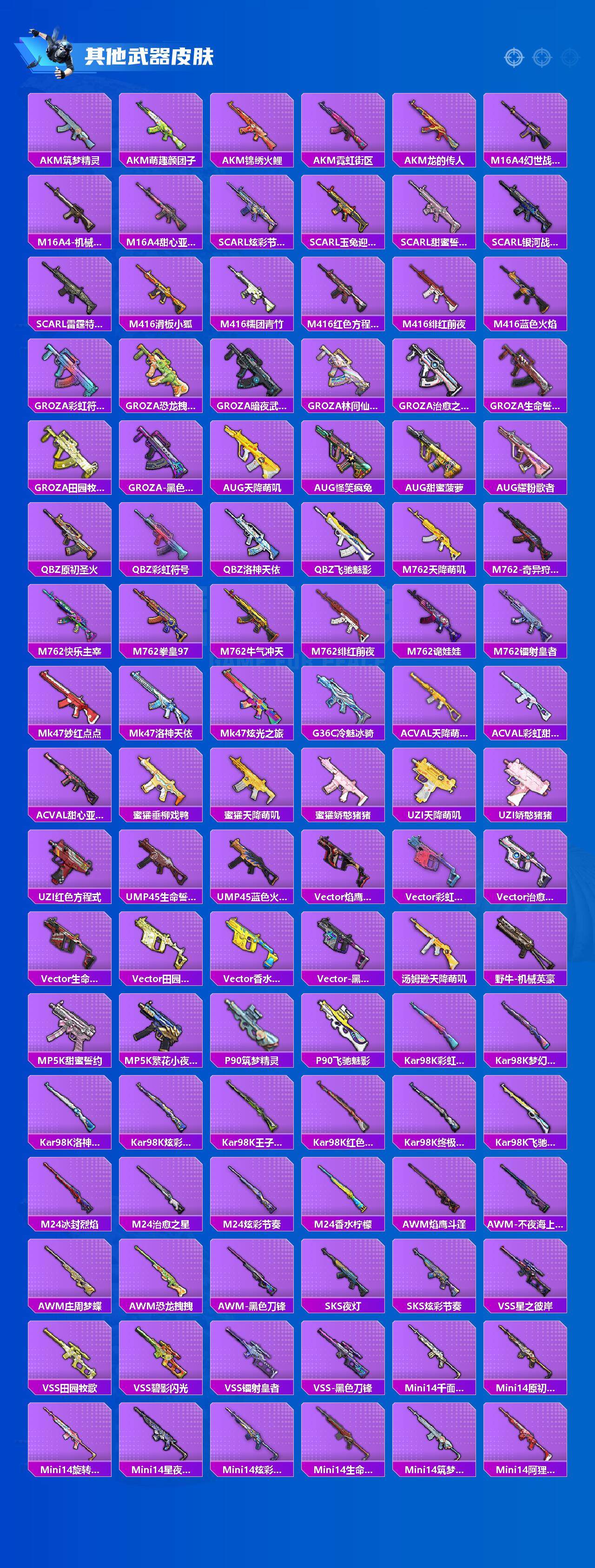 【粉色枪皮】:SCAR-L-童趣迷兔,SCAR-L-锦绣绵绵,M416-五爪金龙,M416-电玩时刻,AUG-星之彼岸,M762-甜蜜誓约,M762-冷魅冰骑,M762-青锋波束,UZI-筑梦精灵,UMP45-量子极限,Kar98K-伏魔团,Kar98K-巳巳如意,DP-28-暗夜鎏金,DP-28-豹影疾电