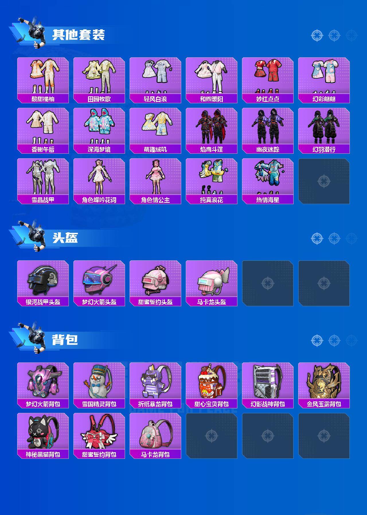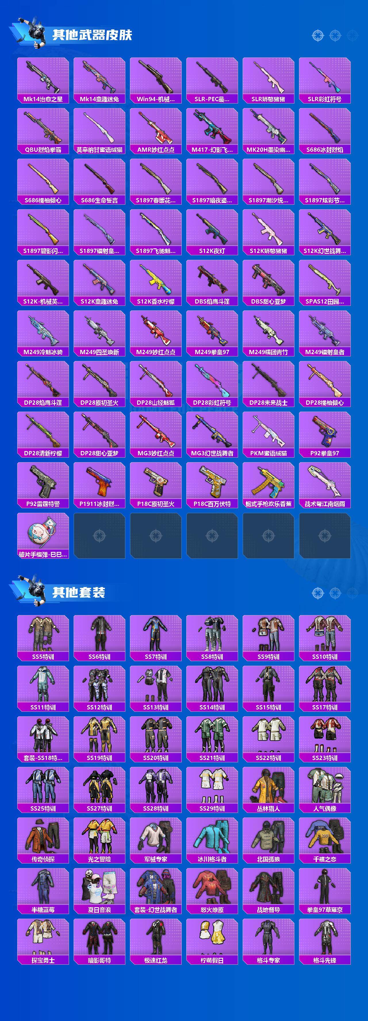 - [11605262]2粉装 7特效枪 3印记 可二次 可修改实名 优质装备:GROZA-镜光银凌,萨利娅,AUG-暖羊咩咩,AMR-智耀战神,MK14-甜梦熊击,Vector-绯穹魔姬,羊梦糖心,Kar98K-巳巳如意 热门装扮:迅捷狂鲨,梦魇先生 稀有枪皮:DP-28-豹影疾电 六级特效枪:六级AMR-智耀战神 五级特效枪:五级GROZA-镜光银凌,五级Kar98K-巳巳如意,五级Vector-绯穹魔姬,五级DP-28-豹影疾电,五级MK14-甜梦熊击,五级AUG-暖羊咩咩 紫色装扮:SS31特训套装,冰川特警,冷焰舞者,旭日情侣,极速光影,SS30特训套装,SS33特训套装,青涩时光,顶瓜瓜,长空猛禽,青年教官,风暴特警,缤纷果语,蓝色运动,街头潮人,超能勇士,魅力单车,黄色伏地魔,黄色名流,黄色运动,黑色伏地魔,龟仙人,冰河战士,龙魂突击队,蝶变,香桃花海,极地朋克,极速红龙,橘黑制服,海岛探路者,清新柠檬,暗黑骑手,湖蓝色名流,绮丽涂鸦,白色伏地魔,破晓战魂,空岛之星,红色运动,燃烧卡路里,猛禽,猎鹰,SS29特训,星途旅人,SS28特训,光矢逐梦,异域银装,鱼渊荷华,燕燕于飞,巳巳如意,森林游猎者,竞技名士,街头风暴,果汁能量,SS27特训,智谋强哥,大橘大利,星影赞美诗,春日漫步,粉恋花,蓝冰羽,紫幽梦,SS32特训服(SS32特训套装),墨青刃影,绯格组合,恋语绒绒,冰冻风暴 优质战备:星途旅人降落伞,忍者神龟降落伞,鬼刀降落伞,月影灵韵降落伞