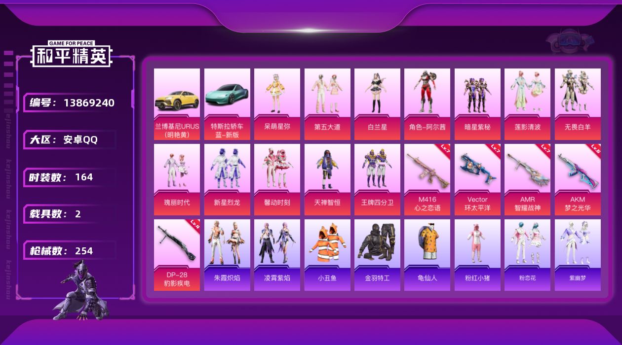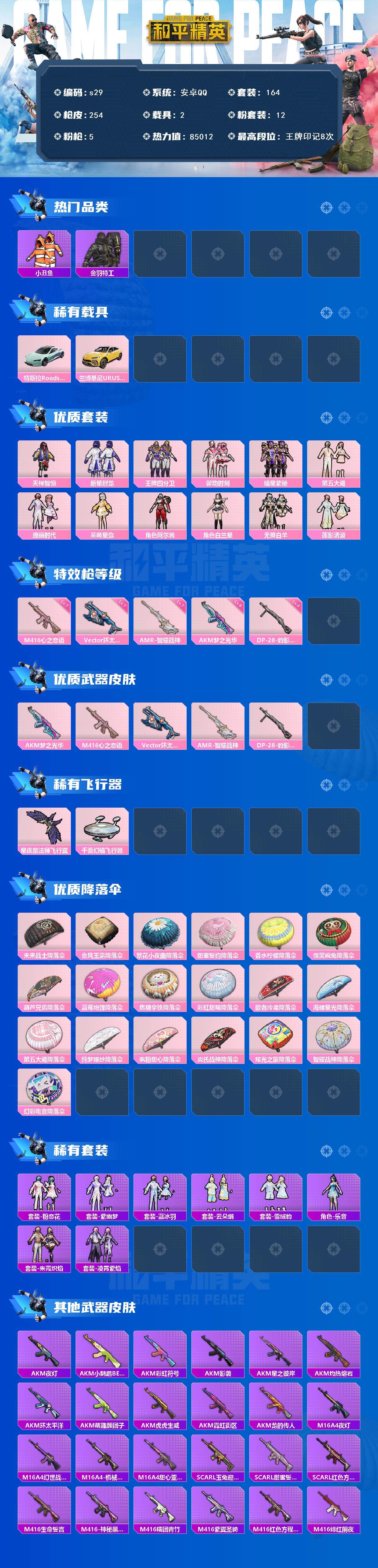[13869240]安卓 手Q-12粉装-5特效枪-2载具-2粉色飞行器-85012热力值-8王牌印记-164套装-254枪皮