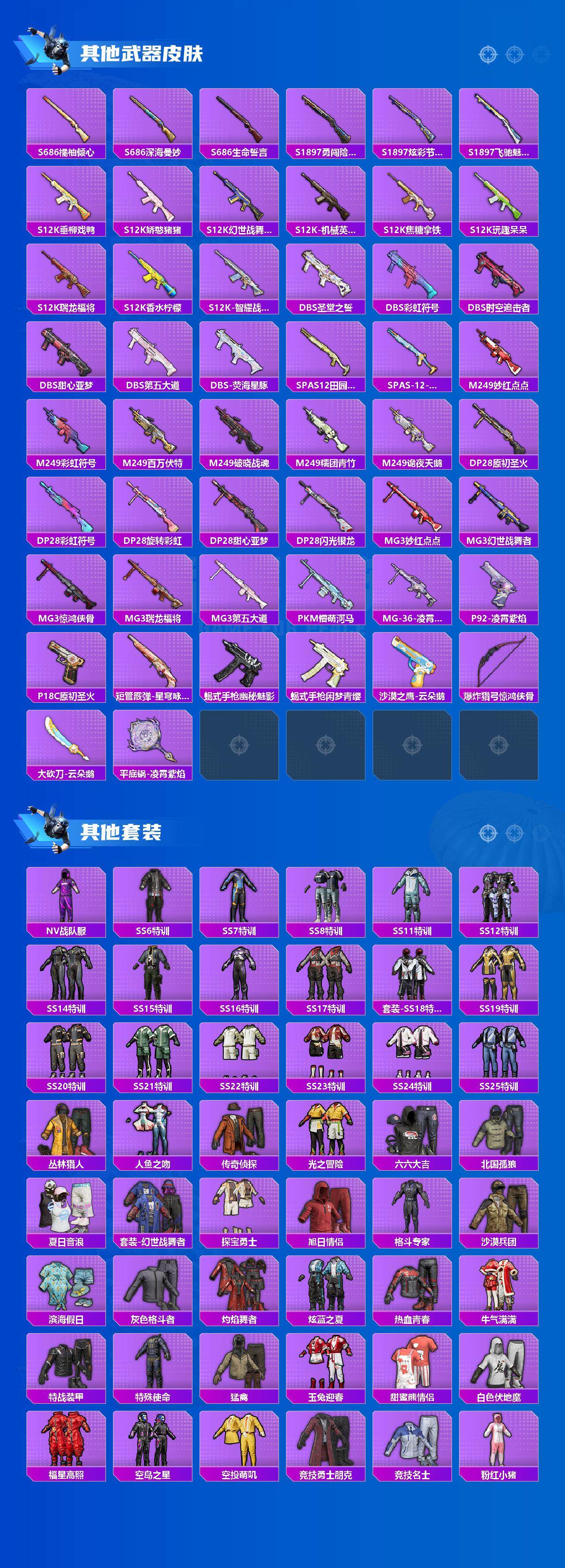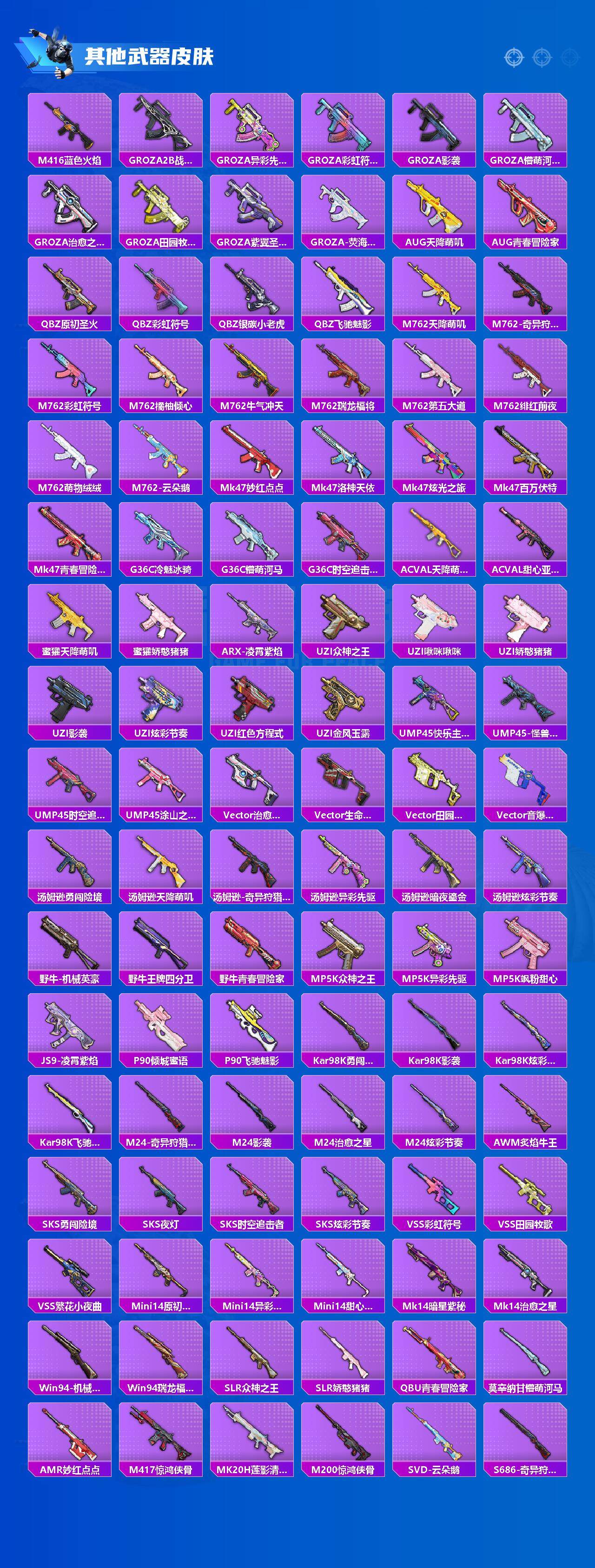 【稀有枪皮】:AKM-夜灯,AKM-小鹦鹉BEBE,AKM-彩虹符号,AKM-影袭,AKM-星之彼岸,AKM-灼热熔岩,AKM-环太平洋,AKM-萌趣颜团子,AKM-虎虎生威,AKM-霓虹街区,AKM-龙的传人,M16A4-夜灯,M16A4-幻世战舞者,M16A4-机械英豪,M16A4-甜心亚梦,SCAR-L-玉兔迎春,SCAR-L-甜蜜誓约,SCAR-L-红色方程式,M416-生命誓言,M416-神秘黑猫,M416-糯团青竹,M416-紫翼圣骑,M416-红色方程式,M416-绯红前夜,M416-蓝色火焰,GROZA-2B战斗服款,GROZA-异彩先驱,GROZA-彩虹符号,GROZA-影袭,GROZA-懵萌河马,GROZA-治愈之星,GROZA-田园牧歌,GROZA-紫翼圣骑,GROZA-荧海星豚
