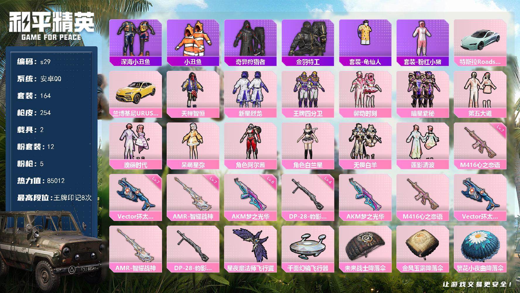 [13869240]安卓 手Q-12粉装-5特效枪-2载具-2粉色飞行器-85012热力值-8王牌印记-164套装-254枪皮 【热门品类】:套装-深海小丑鱼,套装-小丑鱼,套装-奇异狩猎者,套装-金羽特工,套装-龟仙人,套装-粉红小猪 【粉色载具】:特斯拉Roadster(水滴蓝),兰博基尼URUS(明艳黄) 【粉色套装】:粉装-天禅智恒,粉装-新星烈龙,粉装-王牌四分卫,粉装-馨动时刻,粉装-暗星紫秘,粉装-第五大道,粉装-瑰丽时代,角色-呆萌星弥,角色-阿尔茜,角色-白兰星,粉装-无畏白羊,粉装-莲影清波 【粉色枪皮等级】:AKM-梦之光华(六级),M416-心之恋语(七级),Vector-环太平洋(七级),AMR-智耀战神(七级),DP-28-豹影疾电(四级) 【粉色枪皮】:AKM-梦之光华,M416-心之恋语,Vector-环太平洋,AMR-智耀战神,DP-28-豹影疾电 【粉色飞行器】:星夜魔法师飞行翼,千面幻镜飞行器 【粉色降落伞】:未来战士降落伞,金风玉露降落伞,繁花小夜曲降落伞,甜蜜誓约降落伞,香水柠檬降落伞,怪笑疯兔降落伞,葫芦兄弟降落伞,蓝莓炮弹降落伞,焦糖拿铁降落伞,彩虹甜喵降落伞,歌者泠鸢降落伞,海螺星光降落伞,第五大道降落伞,纯梦嫁纱降落伞,飒粉甜心降落伞,炎氏战神降落伞,炫光之旅降落伞,智耀战神降落伞,幻彩电音降落伞 【稀有套装】:套装-龟仙人,套装-粉恋花,套装-紫幽梦,套装-蓝冰羽,套装-云朵鹅,套装-雪绒豹,角色-乐音,套装-朱霞炽焰,套装-凌霄紫焰 【稀有枪皮】:AKM-夜灯,AKM-小鹦鹉BEBE,AKM-彩虹符号,AKM-影袭,AKM-星之彼岸,AKM-灼热熔岩,AKM-环太平洋,AKM-萌趣颜团子,AKM-虎虎生威,AKM-霓虹街区,AKM-龙的传人,M16A4-夜灯,M16A4-幻世战舞者,M16A4-机械英豪,M16A4-甜心亚梦,SCAR-L-玉兔迎春,SCAR-L-甜蜜誓约,SCAR-L-红色方程式,M416-生命誓言,M416-神秘黑猫,M416-糯团青竹,M416-紫翼圣骑,M416-红色方程式,M416-绯红前夜,M416-蓝色火焰,GROZA-2B战斗服款,GROZA-异彩先驱,GROZA-彩虹符号,GROZA-影袭,GROZA-懵萌河马,GROZA-治愈之星,GROZA-田园牧歌,GROZA-紫翼圣骑,GROZA-荧海星豚