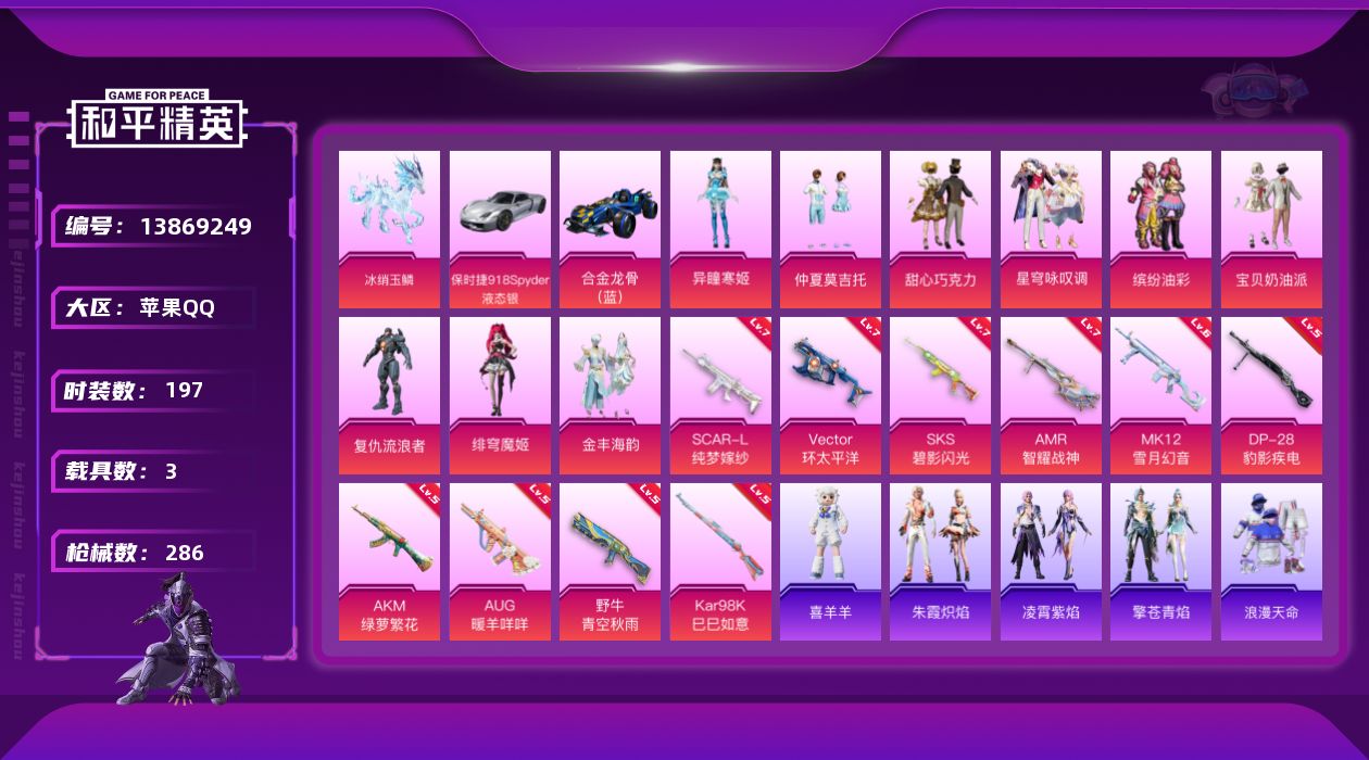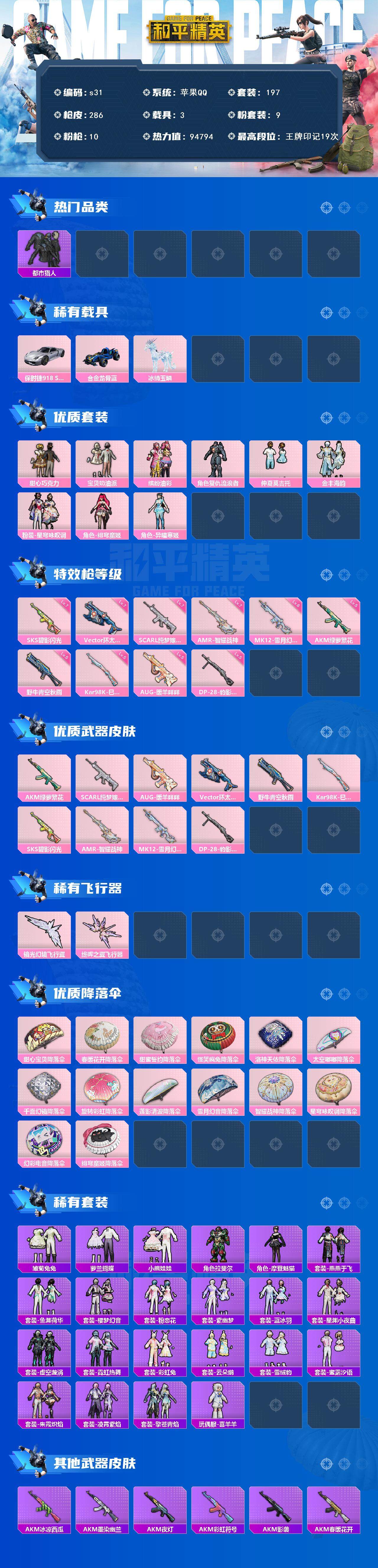 [13869249]苹果 手Q-9粉装-10特效枪-3载具-3粉色飞行器-94794热力值-19王牌印记-197套装-286枪皮 【热门品类】:粉装-缤纷油彩,套装-浪漫天命,套装-都市猎人,套装-龟仙人,套装-暗影哥特 【粉色载具】:保时捷918 Spyder(液态银),合金龙骨(蓝),冰绡玉鳞 【粉色套装】:粉装-甜心巧克力,粉装-宝贝奶油派,粉装-缤纷油彩,角色-复仇流浪者,粉装-仲夏莫吉托,粉装-金丰海韵,粉装-星穹咏叹调,角色-绯穹魔姬,角色-异瞳寒姬 【粉色枪皮等级】:AKM-绿萝繁花(五级),SCAR-L-纯梦嫁纱(七级),AUG-暖羊咩咩(五级),Vector-环太平洋(七级),野牛-青空秋雨(五级),Kar98K-巳巳如意(五级),SKS-碧影闪光(七级),AMR-智耀战神(七级),MK12-雪月幻音(六级),DP-28-豹影疾电(五级) 【粉色枪皮】:AKM-绿萝繁花,SCAR-L-纯梦嫁纱,AUG-暖羊咩咩,Vector-环太平洋,野牛-青空秋雨,Kar98K-巳巳如意,SKS-碧影闪光,AMR-智耀战神,MK12-雪月幻音,DP-28-豹影疾电 【粉色飞行器】:镜光幻境飞行翼,终晖之翼飞行器 【粉色降落伞】:甜心宝贝降落伞,春暖花开降落伞,甜蜜誓约降落伞,怪笑疯兔降落伞,洛神天依降落伞,太空嘟嘟降落伞,千面幻镜降落伞,旋转彩虹降落伞,莲影清波降落伞,雪月幻音降落伞,智耀战神降落伞,星穹咏叹调降落伞,幻彩电音降落伞,绯穹魔姬降落伞 【稀有套装】:套装-龟仙人,套装-雏菊兔兔,套装-萝兰蝴蝶,套装-小熊娃娃,角色-拉斐尔,角色-摩登魅猫,套装-燕燕于飞,套装-鱼渊荷华,套装-樱梦幻音,套装-粉恋花,套装-紫幽梦,套装-蓝冰羽,套装-星渊小夜曲,套装-虚空漩涡,套装-霓虹热舞,套装-彩虹兔,套装-云朵鹅,套装-雪绒豹,套装-蜜露汐语,套装-朱霞炽焰,套装-凌霄紫焰,套装-擎苍青焰,玩偶服-喜羊羊 【稀有枪皮】:AKM-冰凉西瓜,AKM-墨染幽兰,AKM-夜灯,AKM-彩虹符号,AKM-影袭,AKM-春暖花开,AKM-生命誓言,AKM-破晓战魂,AKM-萌趣颜团子,AKM-虎虎生威,AKM-霓虹街区,AKM-龙的传人,M16A4-幻世战舞者,M16A4-甜心亚梦,M16A4-红色方程式,M16A4-蓝色火焰,SCAR-L-炫彩节奏,SCAR-L-玉兔迎春,SCAR-L