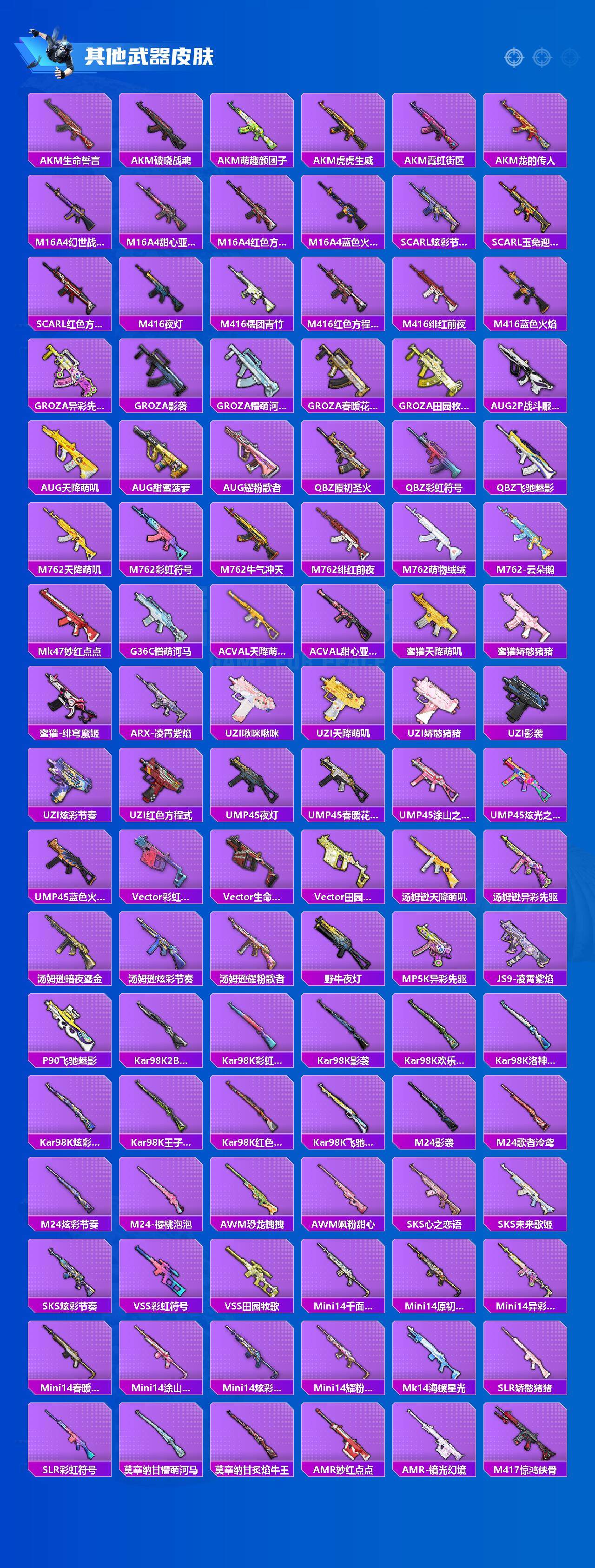 【粉色枪皮】:AKM-绿萝繁花,SCAR-L-纯梦嫁纱,AUG-暖羊咩咩,Vector-环太平洋,野牛-青空秋雨,Kar98K-巳巳如意,SKS-碧影闪光,AMR-智耀战神,MK12-雪月幻音,DP-28-豹影疾电