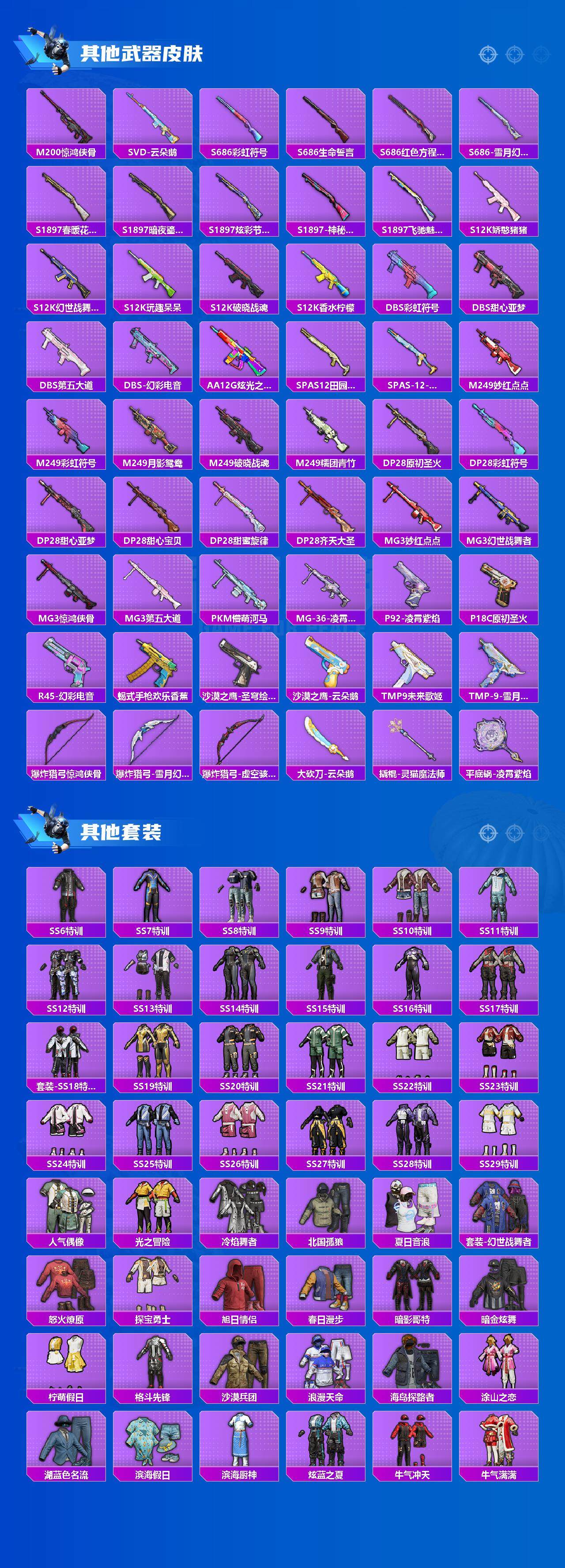 AKM-绿萝繁花,SCAR-L-纯梦嫁纱,AUG-暖羊咩咩,Vector-环太平洋,野牛-青空秋雨,Kar98K-巳巳如意,SKS-碧影闪光,MK12-雪月幻音
