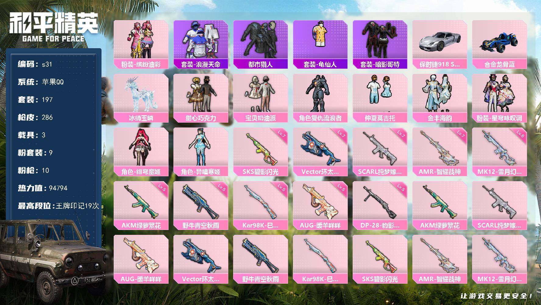 [13869249]苹果 手Q-9粉装-10特效枪-3载具-3粉色飞行器-94794热力值-19王牌印记-197套装-286枪皮