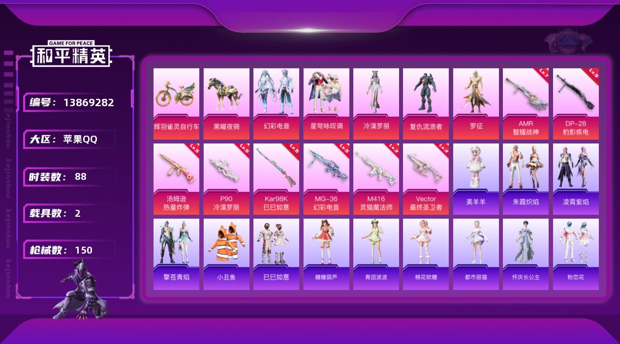[13869282]苹果 手Q-5粉装-9特效枪-2载具-6粉色飞行器-47315热力值-4王牌印记-88套装-150枪皮