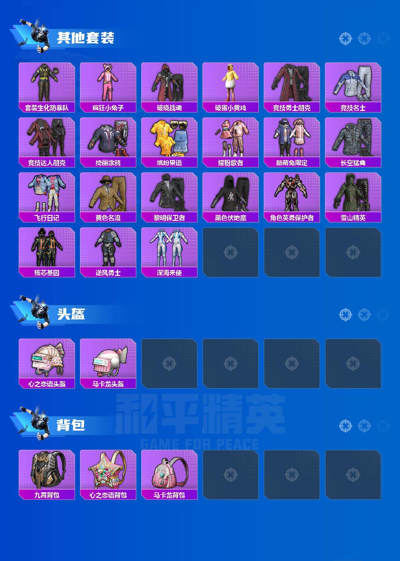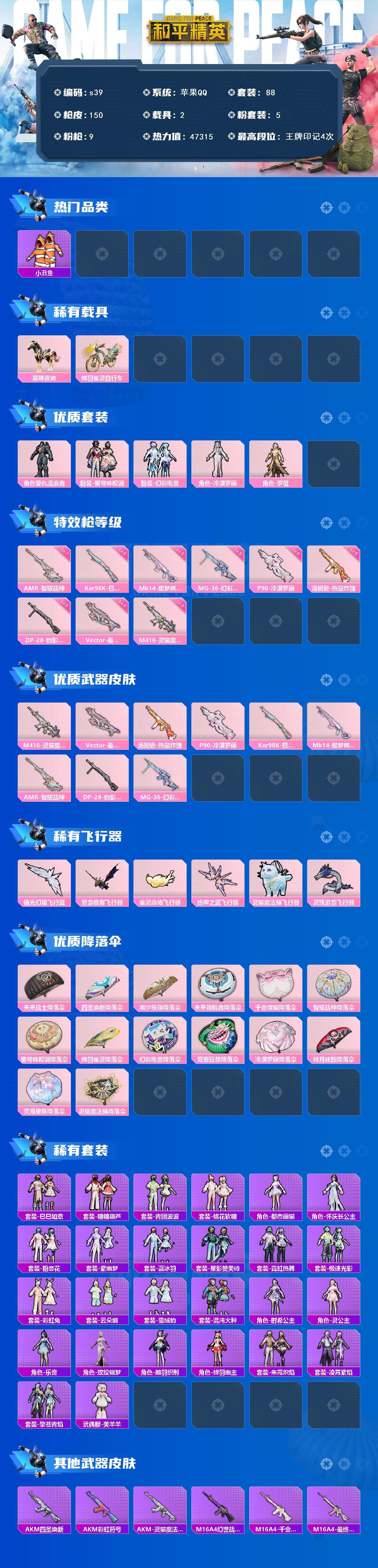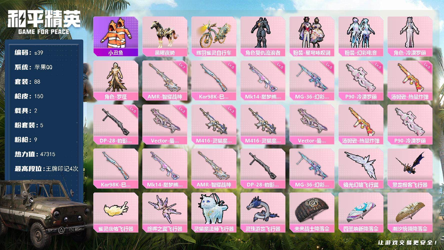 [13869282]苹果 手Q-5粉装-9特效枪-2载具-6粉色飞行器-47315热力值-4王牌印记-88套装-150枪皮 【热门品类】:套装-小丑鱼 【粉色载具】:黑曜夜骑,辉羽雀灵自行车 【粉色套装】:角色-复仇流浪者,粉装-星穹咏叹调,粉装-幻彩电音,角色-冷漠罗丽,角色-罗征 【粉色枪皮等级】:M416-灵猫魔法师(三级),Vector-最终圣卫者(三级),汤姆逊-热量炸弹(五级),P90-冷漠罗丽(五级),Kar98K-巳巳如意(五级),Mk14-甜梦熊击(五级),AMR-智耀战神(七级),DP-28-豹影疾电(五级),MG-36-幻彩电音(五级) 【粉色枪皮】:M416-灵猫魔法师,Vector-最终圣卫者,汤姆逊-热量炸弹,P90-冷漠罗丽,Kar98K-巳巳如意,Mk14-甜梦熊击,AMR-智耀战神,DP-28-豹影疾电,MG-36-幻彩电音 【粉色飞行器】:镜光幻境飞行翼,繁龙极客飞行器,雀灵庇佑飞行器,终晖之翼飞行器,灵猫魔法师飞行器,灵珠游龙飞行器 【粉色降落伞】:未来战士降落伞,四圣焕新降落伞,潮汐统领降落伞,未来领航者降落伞,千金淑猫降落伞,智耀战神降落伞,星穹咏叹调降落伞,辉羽雀灵降落伞,幻彩电音降落伞,双重狂想降落伞,冷漠罗丽降落伞,绯月迷踪降落伞,荧海星豚降落伞,灵猫魔法师降落伞 【稀有套装】:套装-巳巳如意,套装-糖糖葫芦,套装-青团波波,套装-棉花软糖,角色-都市丽猫,角色-怀庆长公主,套装-粉恋花,套装-紫幽梦,套装-蓝冰羽,套装-星影赞美诗,套装-霓虹热舞,套装-极速光影,套装-彩虹兔,套装-云朵鹅,套装-雪绒豹,套装-混沌火种,角色-时希公主,角色-灵公主,角色-乐音,角色-玫纹锢梦,角色-黯羽织刑,角色-绛羽幽主,套装-朱霞炽焰,套装-凌霄紫焰,套装-擎苍青焰,玩偶服-美羊羊 【稀有枪皮】:AKM-四圣焕新,AKM-彩虹符号,AKM-灵猫魔法师,M16A4-幻世战舞者,M16A4-最终圣卫者,M16A4-千金淑猫,SCAR-L-扶摇飞仙,SCAR-L-未来战士,SCAR-L-冷漠罗丽,M416-红色方程式,M416-蓝色火焰,GROZA-春暖花开,GROZA-黑色刀锋,GROZA-荧海星豚,AUG-耀粉歌者,QBZ-原初圣火,M762-天降萌叽,M762-彩虹符号,M762-牛气冲天,M762-云朵鹅,G36C-星穹咏叹调,蜜獾-天降萌叽,