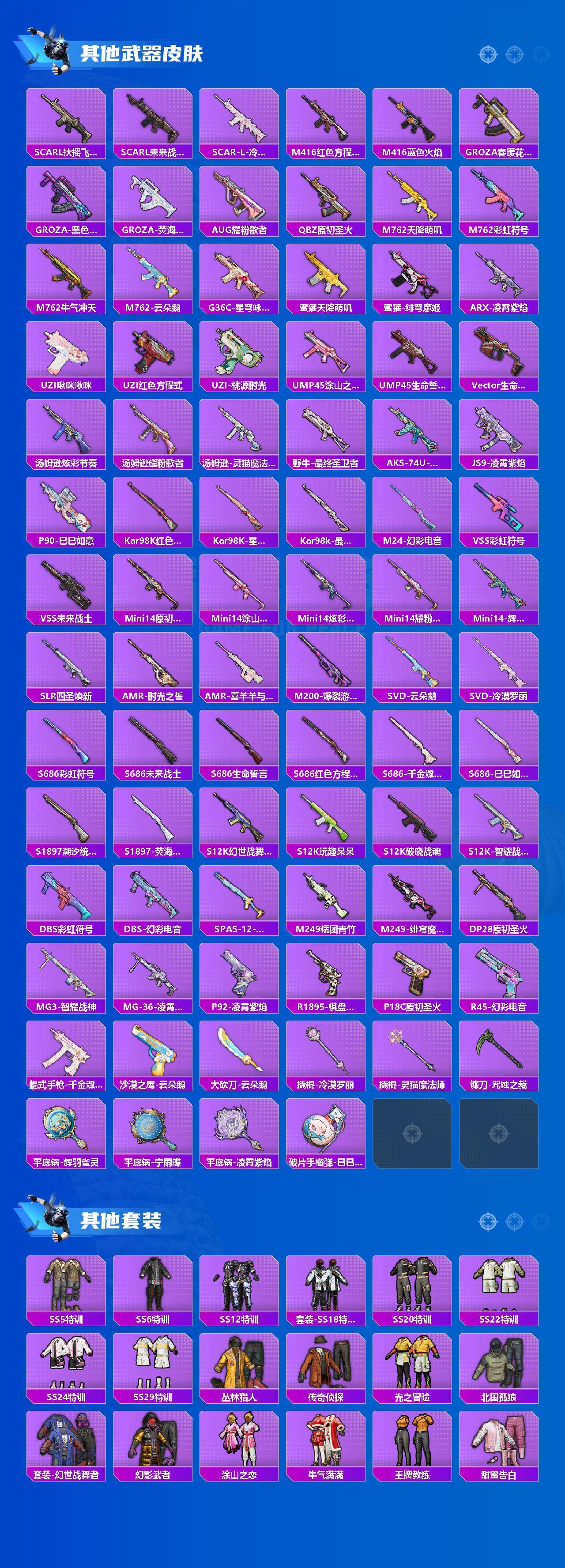 【稀有枪皮】:AKM-四圣焕新,AKM-彩虹符号,AKM-灵猫魔法师,M16A4-幻世战舞者,M16A4-最终圣卫者,M16A4-千金淑猫,SCAR-L-扶摇飞仙,SCAR-L-未来战士,SCAR-L-冷漠罗丽,M416-红色方程式,M416-蓝色火焰,GROZA-春暖花开,GROZA-黑色刀锋,GROZA-荧海星豚,AUG-耀粉歌者,QBZ-原初圣火,M762-天降萌叽,M762-彩虹符号,M762-牛气冲天,M762-云朵鹅,G36C-星穹咏叹调,蜜獾-天降萌叽,