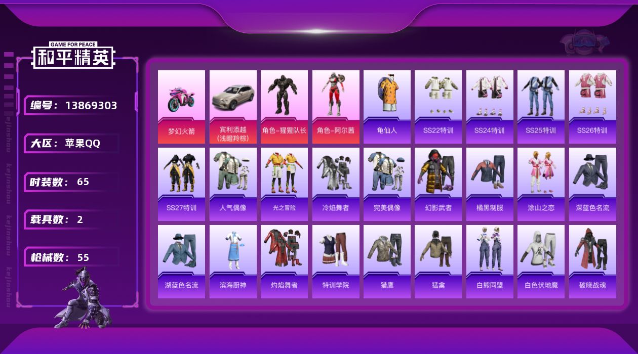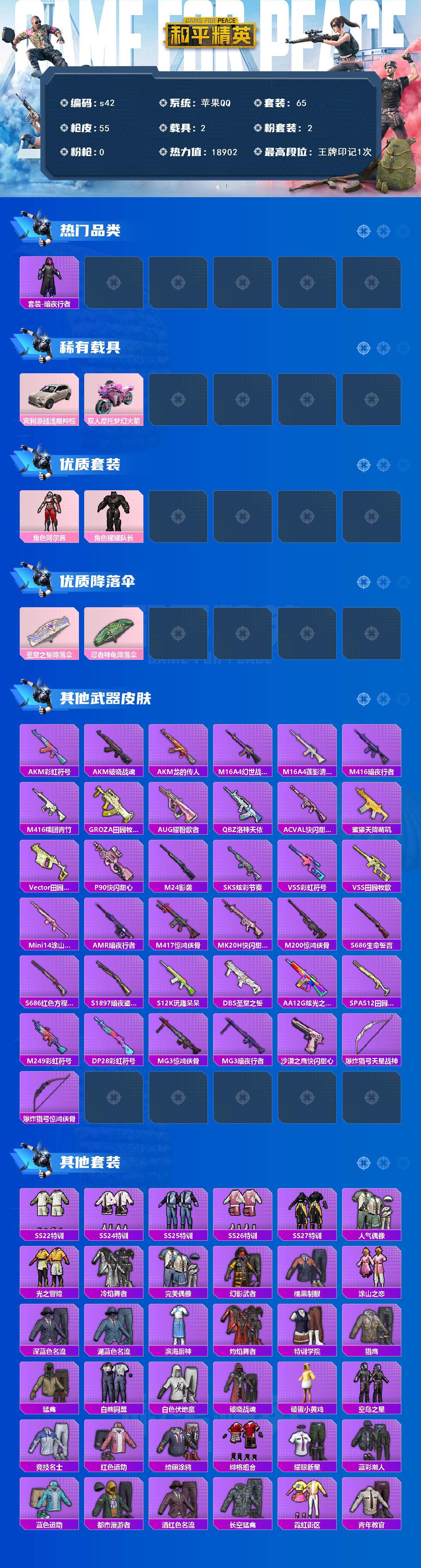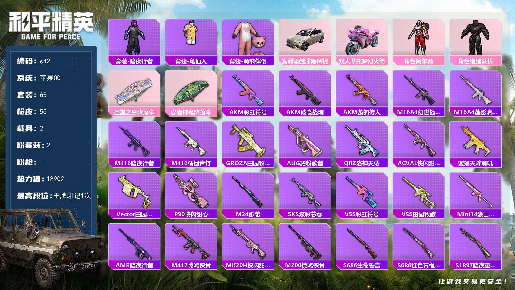 [13869303]苹果 手Q-2粉装-0特效枪-2载具-0粉色飞行器-18902热力值-1王牌印记-65套装-55枪皮 【热门品类】:套装-暗夜行者,套装-龟仙人,套装-萌熊伴侣 【粉色载具】:宾利添越(浅瞪羚棕),双人摩托-梦幻火箭 【粉色套装】:角色-阿尔茜,角色-猩猩队长 【粉色降落伞】:圣堂之誓降落伞,忍者神龟降落伞 【稀有套装】:套装-龟仙人 【稀有枪皮】:AKM-彩虹符号,AKM-破晓战魂,AKM-龙的传人,M16A4-幻世战舞者,M16A4-莲影清波,M416-暗夜行者,M416-糯团青竹,GROZA-田园牧歌,AUG-耀粉歌者,QBZ-洛神天依,AC-VAL-快闪甜心,蜜獾-天降萌叽,Vector-田园牧歌,P90-快闪甜心,M24-影袭,SKS-炫彩节奏,VSS-彩虹符号,VSS-田园牧歌,Mini14-涂山之恋,AMR-暗夜行者,M417-惊鸿侠骨,MK20-H-快闪甜心,M200-惊鸿侠骨,S686-生命誓言,S686-红色方程式,S1897-暗夜鎏金,S12K-玩趣呆呆,DBS-圣堂之誓,AA12-G-炫光之旅,SPAS-12-田园牧歌,M249-彩虹符号,DP-28-彩虹符号,MG3-惊鸿侠骨,MG3-暗夜行者,沙漠之鹰-快闪甜心,爆炸猎弓-天星战神,爆炸猎弓-惊鸿侠骨 【其他套装】:套装-SS22特训,套装-SS24特训,套装-SS25特训,套装-SS26特训,套装-SS27特训,套装-人气偶像,套装-光之冒险,套装-冷焰舞者,套装-完美偶像,套装-幻影武者,套装-橘黑制服,套装-涂山之恋,套装-深蓝色名流,套装-湖蓝色名流,套装-滨海厨神,套装-灼焰舞者,套装-特训学院,套装-猎鹰,套装-猛禽,套装-白熊同盟,套装-白色伏地魔,套装-破晓战魂,套装-破蛋小黄鸡,套装-空岛之星,套装-竞技名士,套装-红色运动,套装-绮丽涂鸦,套装-绯格组合,套装-耀眼新星,套装-蓝彩潮人,套装-蓝色运动,套装-都市漫游者,套装-酒红色名流,套装-长空猛禽,套装-霓虹街区,套装-青年教官,套装-青玉碎影,套装-骑行爱好者,套装-魅力单车,套装-黄色伏地魔,套装-黄色名流,套装-黄色运动,套装-黑色伏地魔,套装-龙的传人,套装-龟仙人,套装-萌熊伴侣,套装-极地朋克,套装-清新柠檬,套装-雪山精英,套装-田园牧歌,套装-轻风白浪,套装-和煦暖阳,套装-绝对偶像,套装-元气发