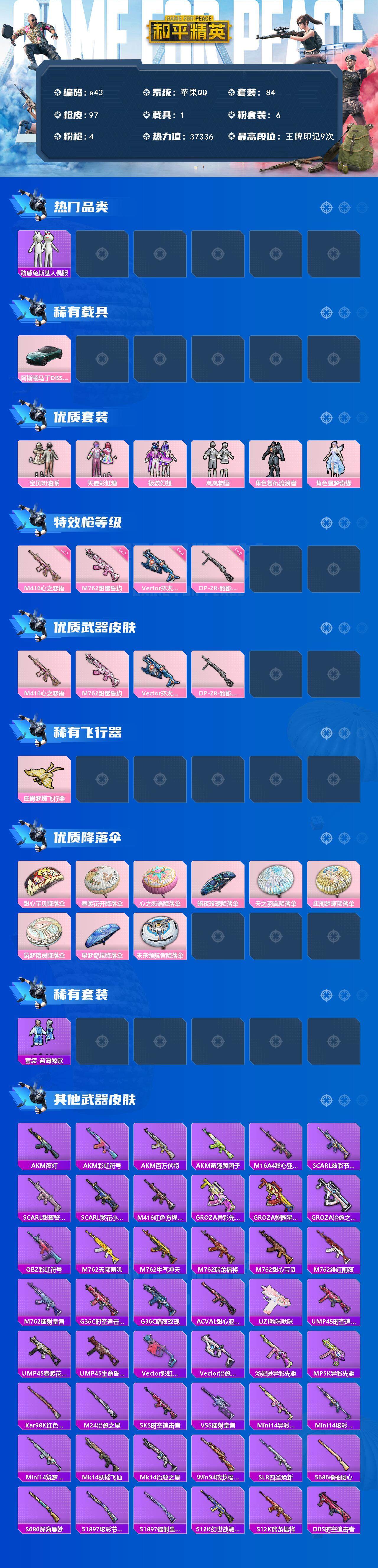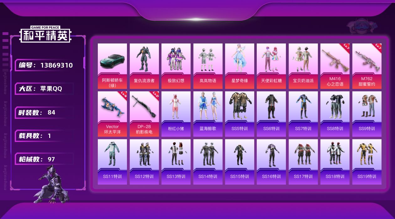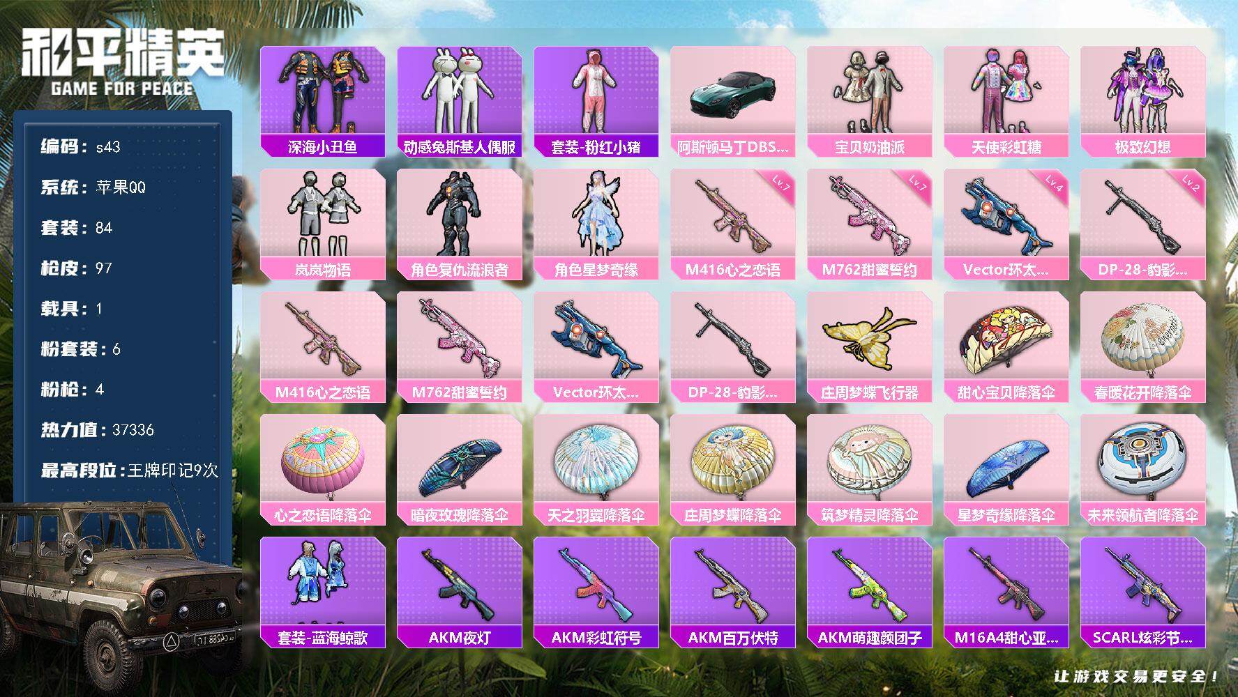 [13869310]苹果 手Q-6粉装-4特效枪-1载具-1粉色飞行器-37336热力值-9王牌印记-84套装-97枪皮