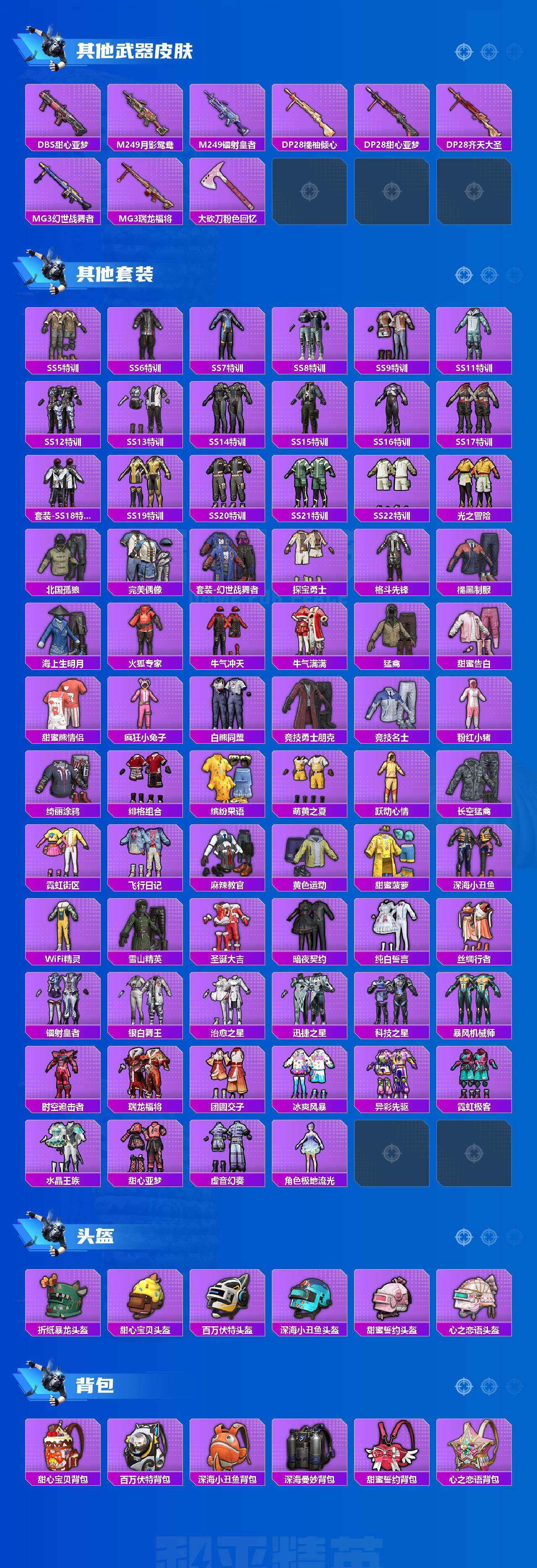 【稀有枪皮】:AKM-夜灯,AKM-彩虹符号,AKM-百万伏特,AKM-萌趣颜团子,M16A4-甜心亚梦,SCAR-L-炫彩节奏,SCAR-L-甜蜜誓约,SCAR-L-繁花小夜曲,M416-红色方程式,GROZA-异彩先驱,GROZA-梨园星光,GROZA-治愈之星,QBZ-彩虹符号,M762-天降萌叽,M762-牛气冲天,M762-瑞龙福将,M762-甜心宝贝,M762-绯红前夜,M762-镭射皇者,G36C-时空追击者,G36C-暗夜玫瑰,AC-VAL-甜心亚梦,UZI-啾咪啾咪,UMP45-时空追击者,UMP45-春暖花开,UMP45-生命誓言,Vector-彩虹符号,Vector-治愈之星,汤姆逊-异彩先驱,MP5K-异彩先驱,Kar98K-红色方程式,M24-治愈之星,SKS-时空追击者,VSS-镭射皇者,Mini14-异彩先驱,Mini14-炫彩节奏,Mini14-筑梦精灵,Mk14-扶摇飞仙,Mk14-治愈之星,Win94-瑞龙福将,SLR-四圣焕新,S686-橘柚倾心,S686-深海曼妙,S1897-炫彩节奏,S1897-镭射皇者,S12K-瑞龙福将,S12K-幻世战舞者,DBS-时空追击者,DBS-甜心亚梦,M249-月影鸳鸯,M249-镭射皇者,DP-28-橘柚倾心,DP-28-甜心亚梦,DP-28-齐天大圣,MG3-幻世战舞者,MG3-瑞龙福将,大砍刀-粉色回忆