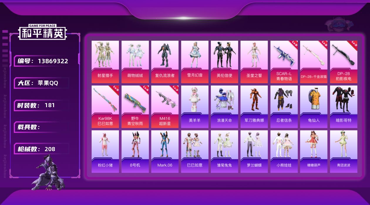 - PX_2111803- 苹果手Q-2王牌印记-4粉装-5特效枪-0载具-33089热力值-74套装-98枪皮-1卓越印记-0传奇印记 【4粉装】,冷漠罗丽,紫电风暴,炙焰牛王,绮梦青鸾 【5特效枪】SCAR-L-甜梦小狐-6级 GROZA-镜光银凌-5级 AUG-暖羊咩咩-5级 Kar98K-巳巳如意-5级 M24-暗星紫秘-5级 【2稀有紫装】,小丑鱼,龟仙人, 【74稀有时装】,SS31特训