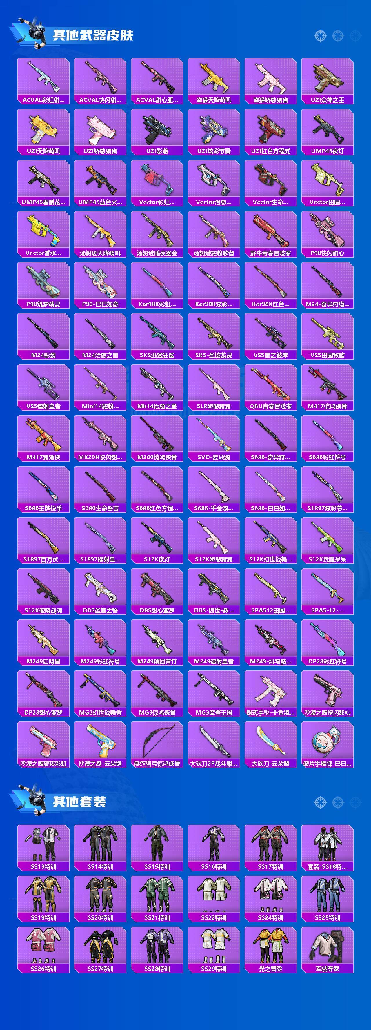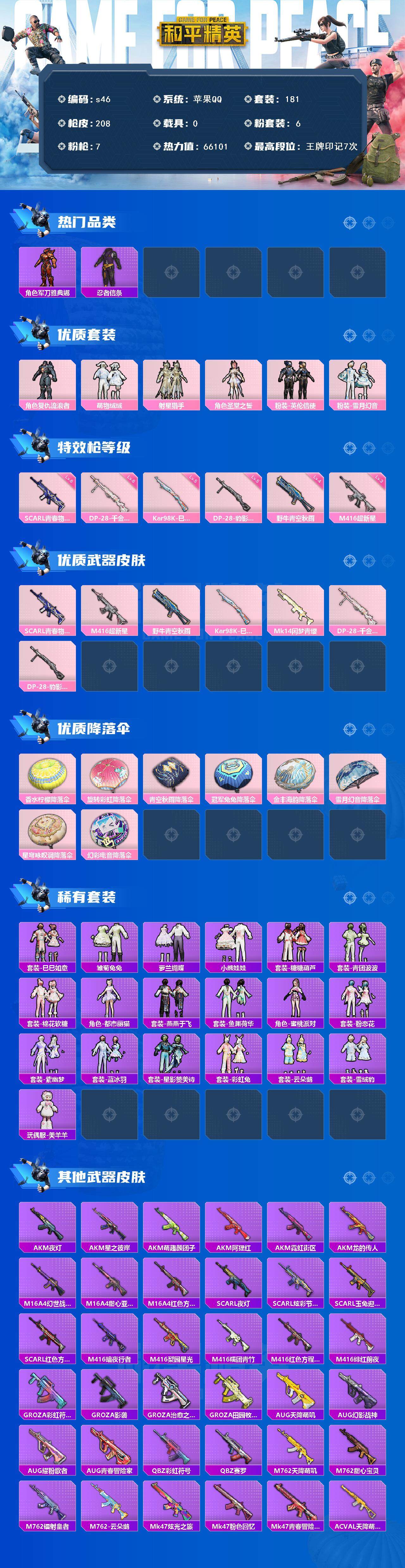 [13869322]苹果 手Q-6粉装-7特效枪-0载具-0粉色飞行器-66101热力值-7王牌印记-181套装-208枪皮 【热门品类】:套装-浪漫天命,角色-军刀雅典娜,套装-忍者信条,套装-龟仙人,套装-暗影哥特,套装-粉红小猪,角色-8号机,角色-Mark.06 【粉色套装】:角色-复仇流浪者,粉装-萌物绒绒,粉装-射星猎手,角色-圣堂之誓,粉装-英伦信使,粉装-雪月幻音 【粉色枪皮等级】:SCAR-L-青春物语(六级),M416-超新星(三级),野牛-青空秋雨(四级),Kar98K-巳巳如意(五级),DP-28-千金淑猫(六级),DP-28-豹影疾电(五级) 【粉色枪皮】:SCAR-L-青春物语,M416-超新星,野牛-青空秋雨,Kar98K-巳巳如意,Mk14-闲梦青缨,DP-28-千金淑猫,DP-28-豹影疾电 【粉色降落伞】:香水柠檬降落伞,旋转彩虹降落伞,青空秋雨降落伞,冠军兔兔降落伞,金丰海韵降落伞,雪月幻音降落伞,星穹咏叹调降落伞,幻彩电音降落伞 【稀有套装】:套装-龟仙人,套装-巳巳如意,套装-雏菊兔兔,套装-萝兰蝴蝶,套装-小熊娃娃,套装-糖糖葫芦,套装-青团波波,套装-棉花软糖,角色-都市丽猫,套装-燕燕于飞,套装-鱼渊荷华,角色-蜜桃派对,套装-粉恋花,套装-紫幽梦,套装-蓝冰羽,套装-星影赞美诗,套装-彩虹兔,套装-云朵鹅,套装-雪绒豹,玩偶服-美羊羊 【稀有枪皮】:AKM-夜灯,AKM-星之彼岸,AKM-萌趣颜团子,AKM-阿狸红,AKM-霓虹街区,AKM-龙的传人,M16A4-幻世战舞者,M16A4-甜心亚梦,M16A4-红色方程式,SCAR-L-夜灯,SCAR-L-炫彩节奏,SCAR-L-玉兔迎春,SCAR-L-红色方程式,M416-暗夜行者,M416-梨园星光,M416-糯团青竹,M416-红色方程式,M416-绯红前夜,GROZA-彩虹符号,GROZA-影袭,GROZA-治愈之星,GROZA-田园牧歌,AUG-天降萌叽,AUG-幻影战神,AUG-耀粉歌者,AUG-青春冒险家,QBZ-彩虹符号,QBZ-赛罗,M762-天降萌叽,M762-甜心宝贝,M762-镭射皇者,M762-云朵鹅,Mk47-炫光之旅,Mk47-粉色回忆,Mk47-青春冒险家,AC-VAL-天降萌叽,AC-VAL-彩虹甜喵,AC-VAL-快闪甜心,AC-VAL-甜心亚梦,蜜獾