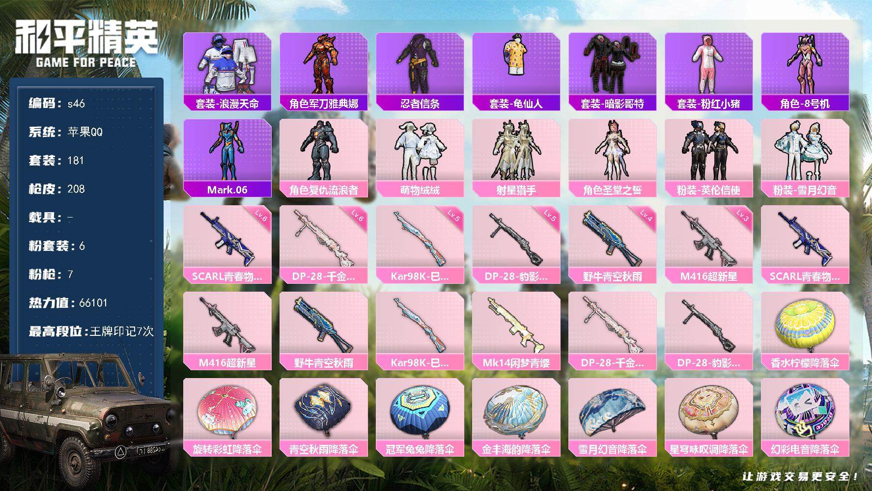 [13869322]苹果 手Q-6粉装-7特效枪-0载具-0粉色飞行器-66101热力值-7王牌印记-181套装-208枪皮