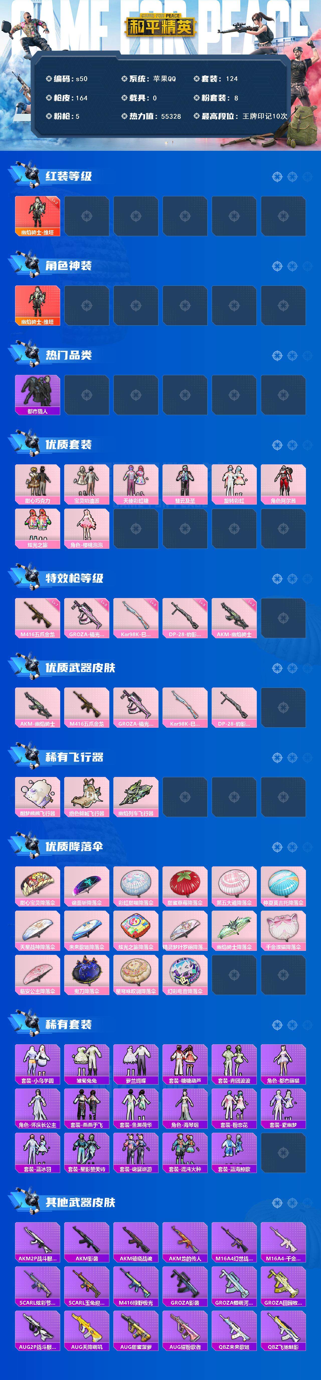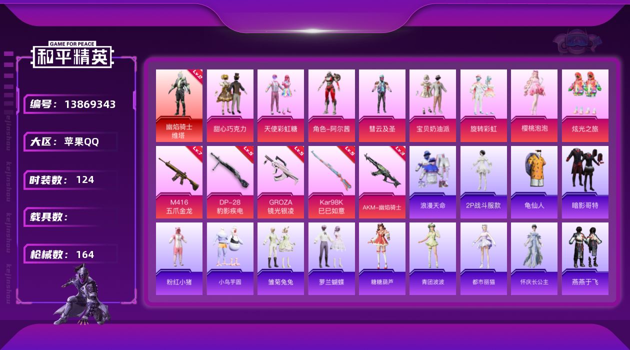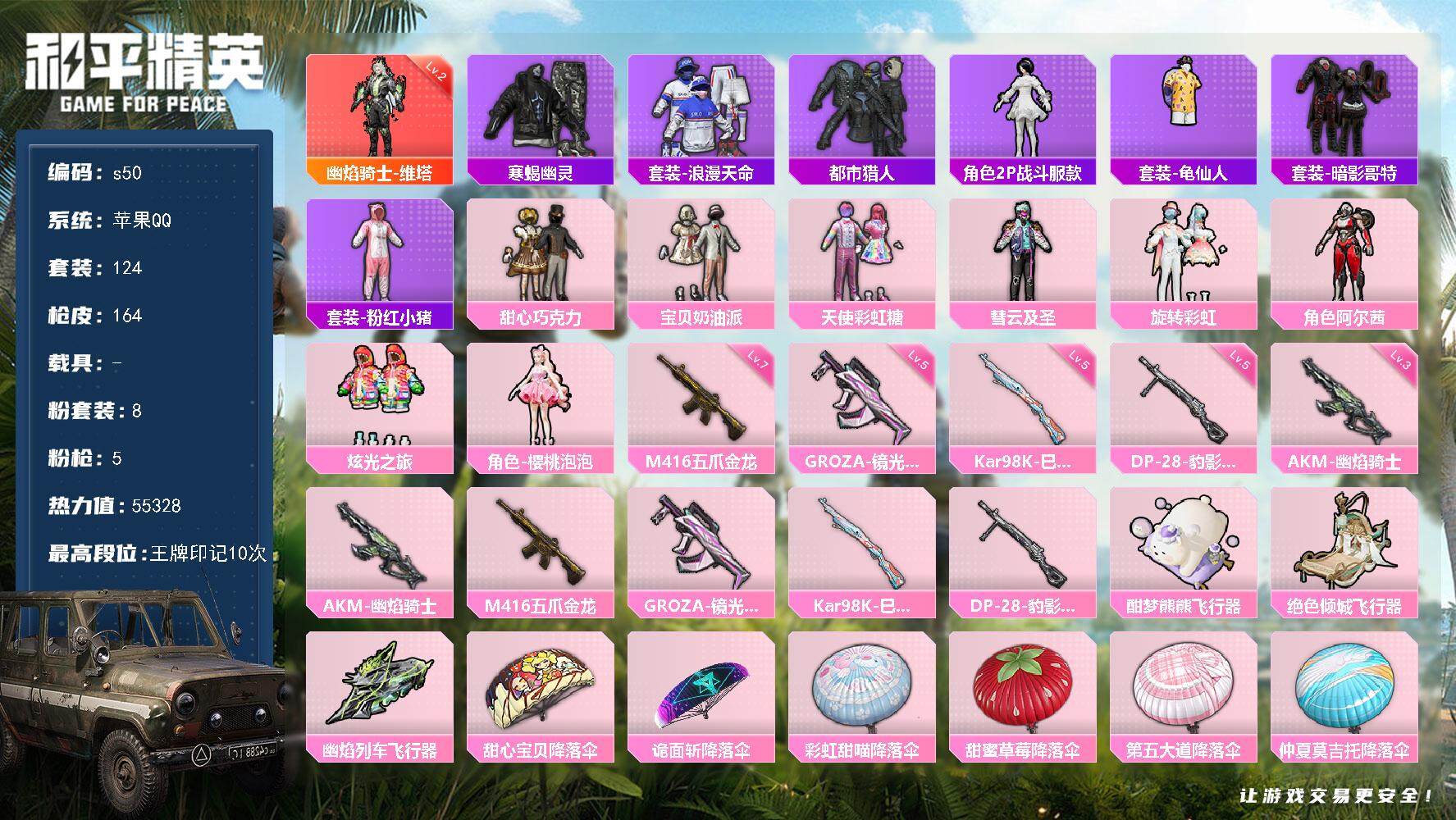 [13869343]苹果 手Q-1神装-8粉装-5特效枪-0载具-4粉色飞行器-55328热力值-10王牌印记-124套装-164枪皮