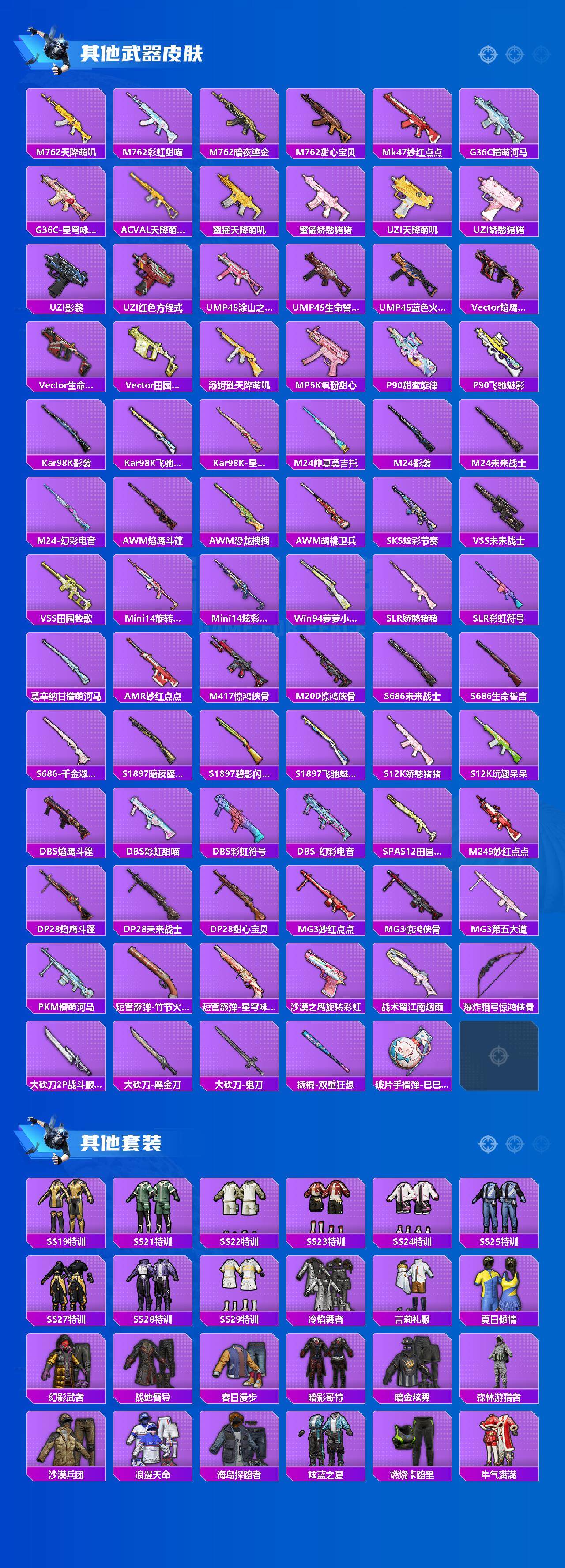 【稀有枪皮】:AKM-2P战斗服款,AKM-影袭,AKM-破晓战魂,AKM-龙的传人,M16A4-幻世战舞者,M16A4-千金淑猫,SCAR-L-炫彩节奏,SCAR-L-玉兔迎春,M416-绿野极光,GROZA-影袭,GROZA-懵萌河马,GROZA-田园牧歌,AUG-2P战斗服款,AUG-天降萌叽,AUG-甜蜜菠萝,AUG-耀粉歌者,QBZ-未来歌姬,QBZ-飞驰魅影,M762-天降萌叽,M762-彩虹甜喵,M762-暗夜鎏金,M762-甜心宝贝,Mk47-妙红点点,G36C-懵萌河马,G36C-星穹咏叹调,AC-VAL-天降萌叽,蜜獾-天降萌叽,蜜獾-娇憨猪猪,UZI-天降萌叽,UZI-娇憨猪猪,UZI