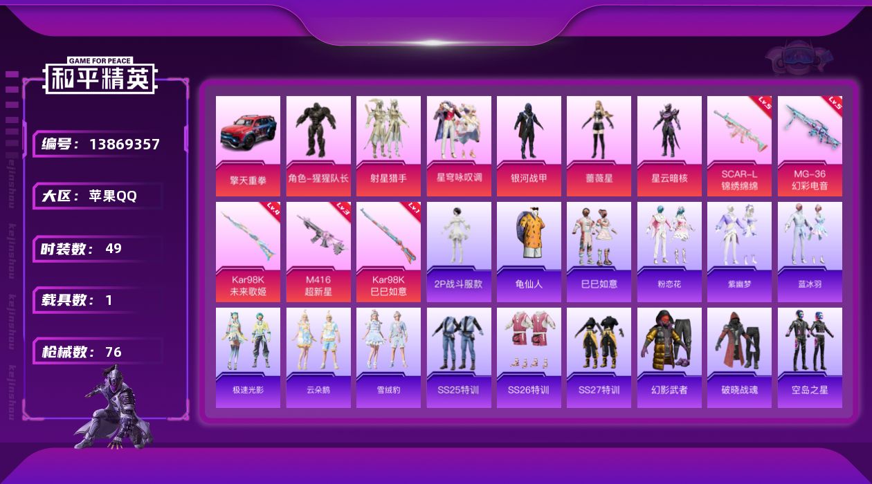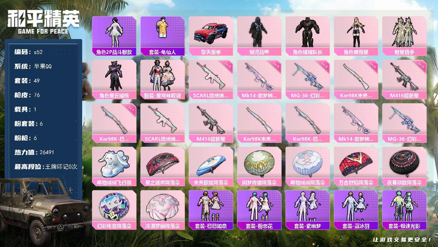 [13869357]苹果 手Q-6粉装-6特效枪-1载具-1粉色飞行器-26491热力值-1王牌印记-49套装-76枪皮