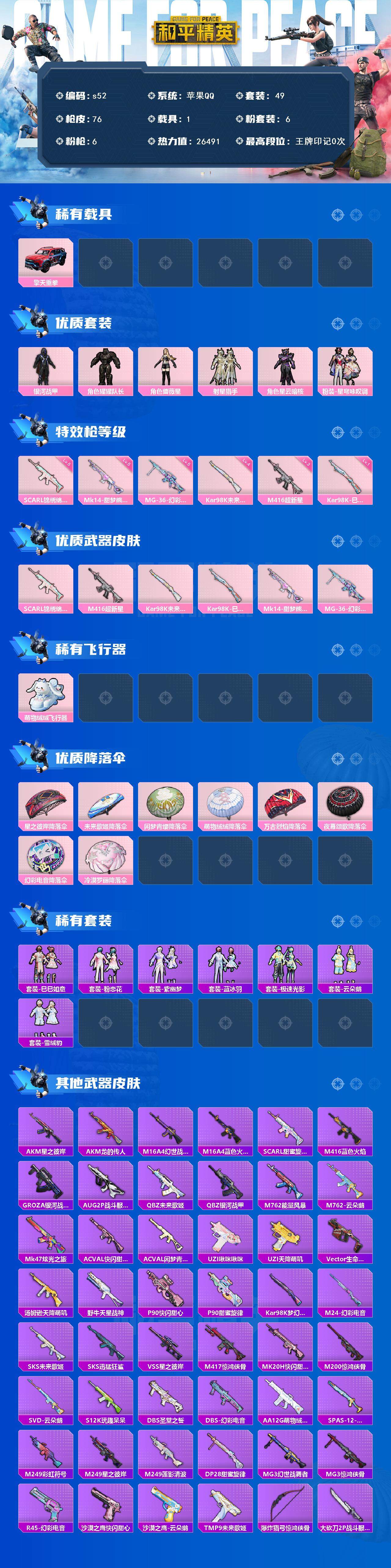 [13869357]苹果 手Q-6粉装-6特效枪-1载具-1粉色飞行器-26491热力值-1王牌印记-49套装-76枪皮 【热门品类】:角色-2P战斗服款,套装-龟仙人 【粉色载具】:擎天重拳 【粉色套装】:粉装-银河战甲,角色-猩猩队长,角色-蔷薇星,粉装-射星猎手,角色-星云暗核,粉装-星穹咏叹调 【粉色枪皮等级】:SCAR-L-锦绣绵绵(五级),M416-超新星(三级),Kar98K-未来歌姬(四级),Kar98K-巳巳如意(一级),Mk14-甜梦熊击(五级),MG-36-幻彩电音(五级) 【粉色枪皮】:SCAR-L-锦绣绵绵,M416-超新星,Kar98K-未来歌姬,Kar98K-巳巳如意,Mk14-甜梦熊击,MG-36-幻彩电音 【粉色飞行器】:萌物绒绒飞行器 【粉色降落伞】:星之彼岸降落伞,未来歌姬降落伞,闲梦青缨降落伞,萌物绒绒降落伞,万古烈焰降落伞,夜幕颂歌降落伞,幻彩电音降落伞,冷漠罗丽降落伞 【稀有套装】:套装-龟仙人,套装-巳巳如意,套装-粉恋花,套装-紫幽梦,套装-蓝冰羽,套装-极速光影,套装-云朵鹅,套装-雪绒豹 【稀有枪皮】:AKM-星之彼岸,AKM-龙的传人,M16A4-幻世战舞者,M16A4-蓝色火焰,SCAR-L-甜蜜旋律,M416-蓝色火焰,GROZA-银河战甲,AUG-2P战斗服款,QBZ-未来歌姬,QBZ-银河战甲,M762-能量风暴,M762-云朵鹅,Mk47-炫光之旅,AC-VAL-快闪甜心,AC-VAL-闲梦青缨,UZI-啾咪啾咪,UZI-天降萌叽,Vector-生命誓言,汤姆逊-天降萌叽,野牛-天星战神,P90-快闪甜心,P90-甜蜜旋律,Kar98K-梦幻火箭,M24-幻彩电音,SKS-未来歌姬,SKS-迅猛狂鲨,VSS-星之彼岸,M417-惊鸿侠骨,MK20-H-快闪甜心,M200-惊鸿侠骨,SVD-云朵鹅,S12K-玩趣呆呆,DBS-圣堂之誓,DBS-幻彩电音,AA12-G-萌物绒绒,SPAS-12-云朵鹅,M249-彩虹符号,M249-星之彼岸,M249-莲影清波,DP-28-甜蜜旋律,MG3-幻世战舞者,MG3-惊鸿侠骨,R45-幻彩电音,沙漠之鹰-快闪甜心,沙漠之鹰-云朵鹅,TMP-9-未来歌姬,爆炸猎弓-惊鸿侠骨,大砍刀-2P战斗服款,大砍刀-云朵鹅 【其他套装】:套装-SS25特训,套装-SS26特训,套装-SS27特训