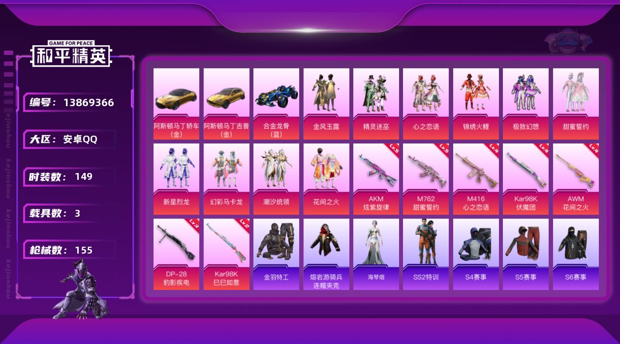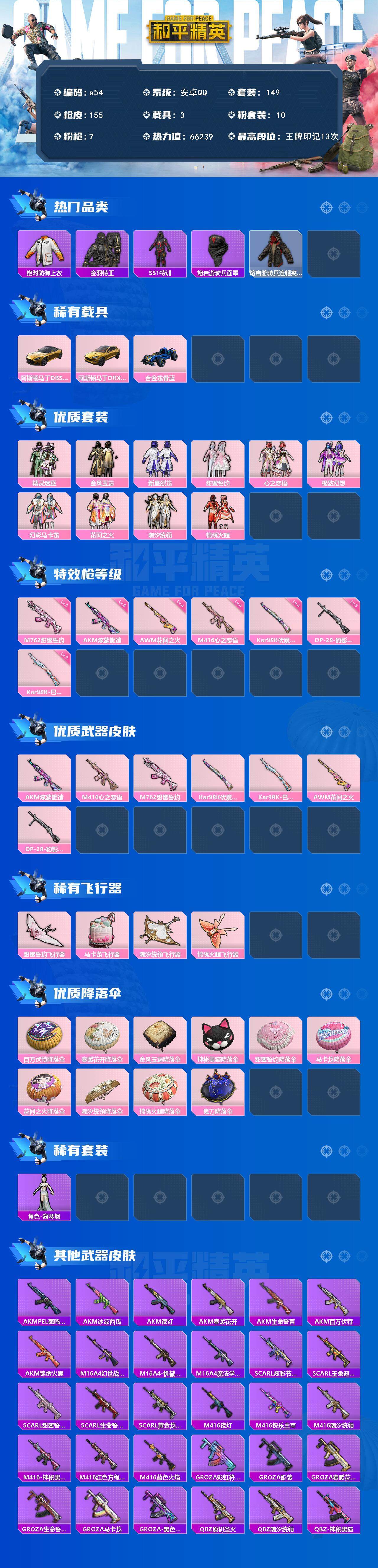 [13869366]安卓 手Q-10粉装-7特效枪-3载具-4粉色飞行器-66239热力值-13王牌印记-149套装-155枪皮