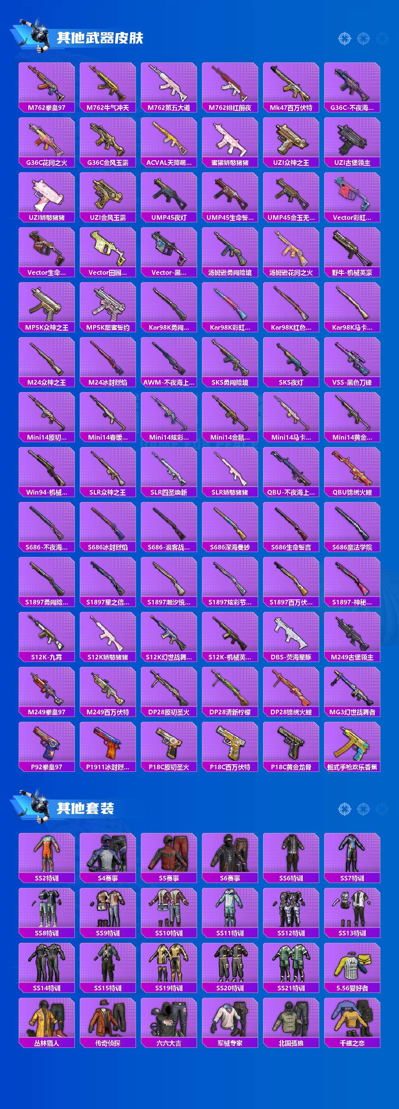 【稀有枪皮】:AKM-PEL轰鸣竞梦者,AKM-冰凉西瓜,AKM-夜灯,AKM-春暖花开,AKM-生命誓言,AKM-百万伏特,AKM-锦绣火鲤,M16A4-幻世战舞者,M16A4-机械英豪,M16A4-魔法学院,SCAR-L-炫彩节奏,SCAR-L-玉兔迎春,SCAR-L-甜蜜誓约,SCAR-L-生命誓言,SCAR-L-黄金龙骨,M416-夜灯,M416-快乐主宰,M416-潮汐统领,M416-神秘黑猫,M416-红色方程式,M416-蓝色火焰,GROZA-彩虹符号,GROZA-影袭,GROZA-春暖花开,GROZA-生命誓言,GROZA-马卡龙,GROZA-黑色刀锋,QBZ-原初圣火,QBZ-潮汐统领,QBZ-神秘黑猫,M762-拳皇97,M762-牛气冲天,M762-第五大道,M762-绯红前夜,Mk47-百万伏特,G36C-不夜海上花,G36C-花间之火,G36C-金风玉露,AC-VAL-天降萌叽,蜜獾-娇憨猪猪,U