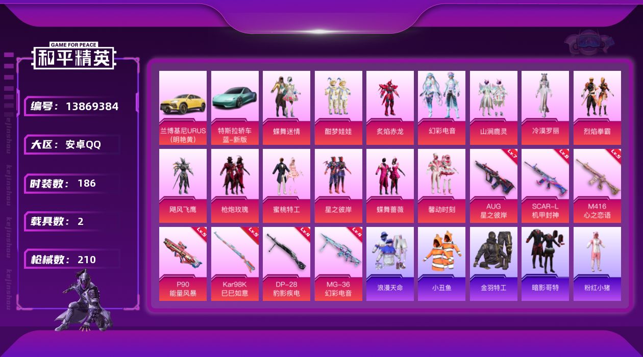 [13869384]安卓 手Q-13粉装-7特效枪-2载具-2粉色飞行器-76569热力值-12王牌印记-186套装-210枪皮