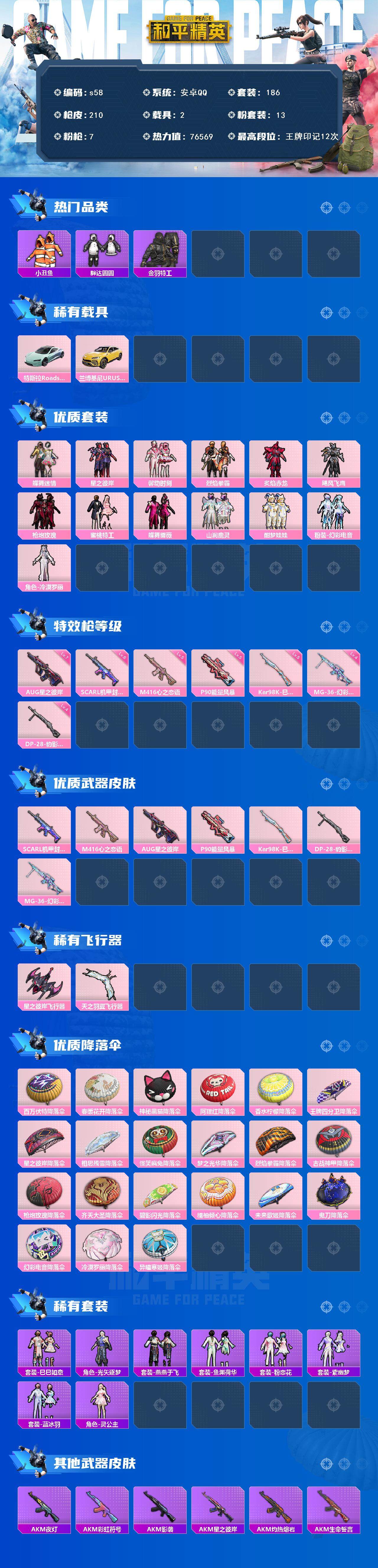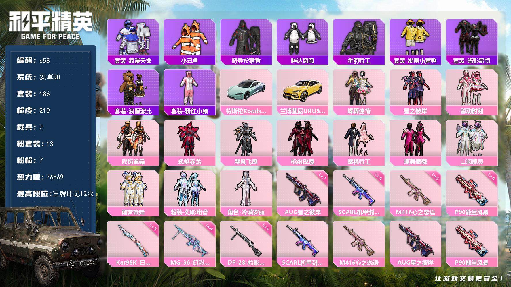 [13869384]安卓 手Q-13粉装-7特效枪-2载具-2粉色飞行器-76569热力值-12王牌印记-186套装-210枪皮 【热门品类】:套装-浪漫天命,套装-小丑鱼,套装-奇异狩猎者,套装-胖达圆圆,套装-金羽特工,套装-潮萌小黄鸭,套装-暗影哥特,套装-浪漫波比,套装-粉红小猪 【粉色载具】:特斯拉Roadster(水滴蓝),兰博基尼URUS(明艳黄) 【粉色套装】:粉装-蝶舞迷情,粉装-星之彼岸,粉装-馨动时刻,粉装-烈焰拳霸,粉装-炙焰赤龙,粉装-飓风飞鹰,粉装-枪炮玫瑰,粉装-蜜桃特工,粉装-蝶舞蔷薇,粉装-山涧鹿灵,粉装-酣梦娃娃,粉装-幻彩电音,角色-冷漠罗丽 【粉色枪皮等级】:SCAR-L-机甲封神(六级),M416-心之恋语(五级),AUG-星之彼岸(七级),P90-能量风暴(五级),Kar98K-巳巳如意(五级),DP-28-豹影疾电(四级),MG-36-幻彩电音(四级) 【粉色枪皮】:SCAR-L-机甲封神,M416-心之恋语,AUG-星之彼岸,P90-能量风暴,Kar98K-巳巳如意,DP-28-豹影疾电,MG-36-幻彩电音 【粉色飞行器】:星之彼岸飞行器,天之羽翼飞行器 【粉色降落伞】:百万伏特降落伞,春暖花开降落伞,神秘黑猫降落伞,阿狸红降落伞,香水柠檬降落伞,王牌四分卫降落伞,星之彼岸降落伞,相思残雪降落伞,怪笑疯兔降落伞,梦之光华降落伞,烈焰拳霸降落伞,古战神甲降落伞,枪炮玫瑰降落伞,齐天大圣降落伞,碧影闪光降落伞,橘柚倾心降落伞,未来歌姬降落伞,鬼刀降落伞,幻彩电音降落伞,冷漠罗丽降落伞,异瞳寒姬降落伞 【稀有套装】:套装-巳巳如意,角色-光矢逐梦,套装-燕燕于飞,套装-鱼渊荷华,套装-粉恋花,套装-紫幽梦,套装-蓝冰羽,角色-灵公主 【稀有枪皮】:AKM-夜灯,AKM-彩虹符号,AKM-影袭,AKM-星之彼岸,AKM-灼热熔岩,AKM-生命誓言,AKM-破晓战魂,AKM-缤纷海域,AKM-萌趣颜团子,AKM-虎虎生威,AKM-霓虹街区,AKM-龙的传人,M16A4-幻世战舞者,M16A4-甜心亚梦,M16A4-蓝色火焰,SCAR-L-玉兔迎春,SCAR-L-王牌四分卫,SCAR-L-红色方程式,M416-仓鼠灰灰,M416-夜灯,M416-糯团青竹,M416-红色方程式,GROZA-异彩先驱,GROZA-彩虹符号,GROZA-春暖花开,GR