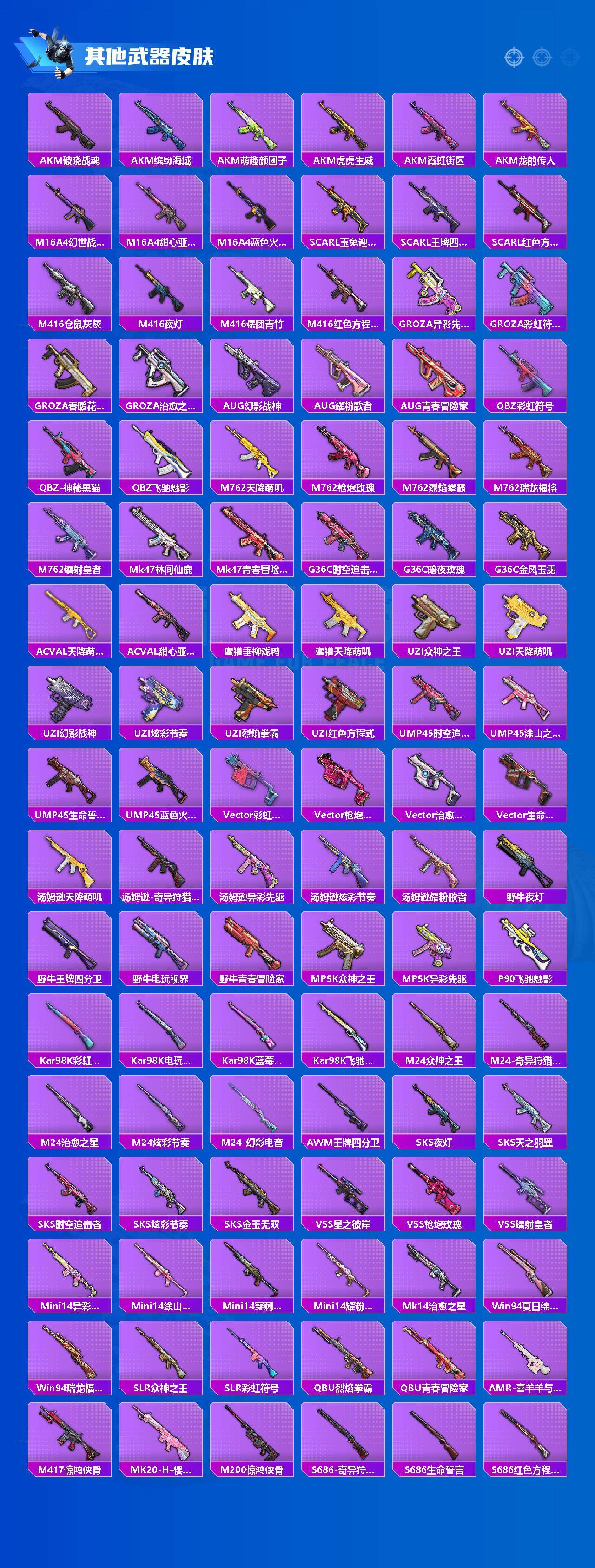【稀有枪皮】:AKM-夜灯,AKM-彩虹符号,AKM-影袭,AKM-星之彼岸,AKM-灼热熔岩,AKM-生命誓言,AKM-破晓战魂,AKM-缤纷海域,AKM-萌趣颜团子,AKM-虎虎生威,AKM-霓虹街区,AKM-龙的传人,M16A4-幻世战舞者,M16A4-甜心亚梦,M16A4-蓝色火焰,SCAR-L-玉兔迎春,SCAR-L-王牌四分卫,SCAR-L-红色方程式,M416-仓鼠灰灰,M416-夜灯,M416-糯团青竹,M416-红色方程式,GROZA-异彩先驱,GROZA-彩虹符号,GROZA-春暖花开,GR