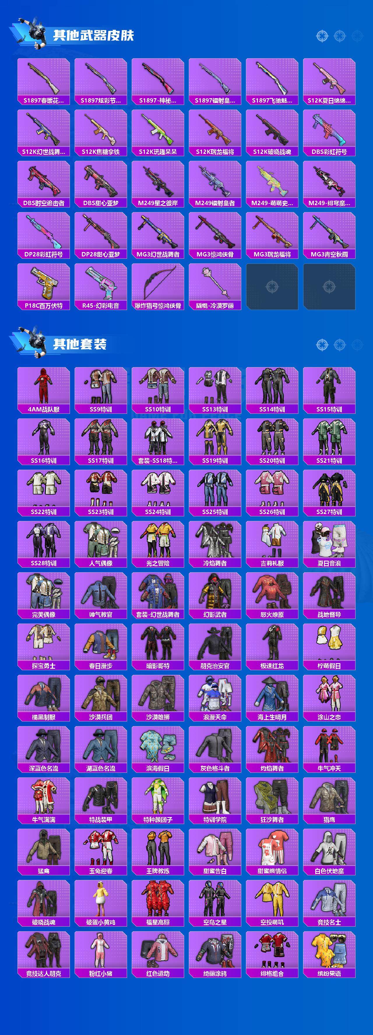 - PX_2097826-??框 新101】安卓Q-YXc11450【可二次】【因赛季更新游戏段付以上号为准!】 19王牌印记 历史无敌战神 181套装 229枪皮 【1载具】 兰博轿车灰色 【7粉装】 梦幻火箭 猪猪侠 新星烈龙 俏皮狐尾 海螺星光 吟月归客 复仇流浪者 【4特效枪】 DP-28-暗夜鎏金 (4级) M416-风花雪月 (7级) M249-彩虹甜喵 (5级) S12K-海渊国主 (7