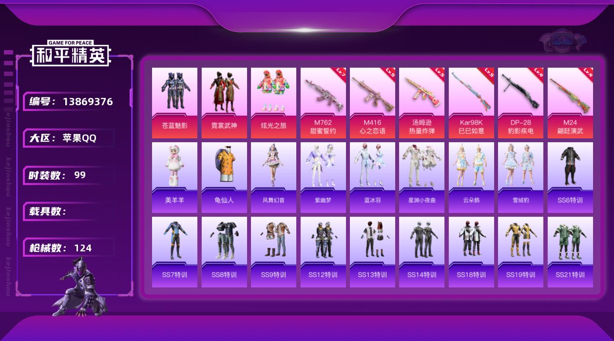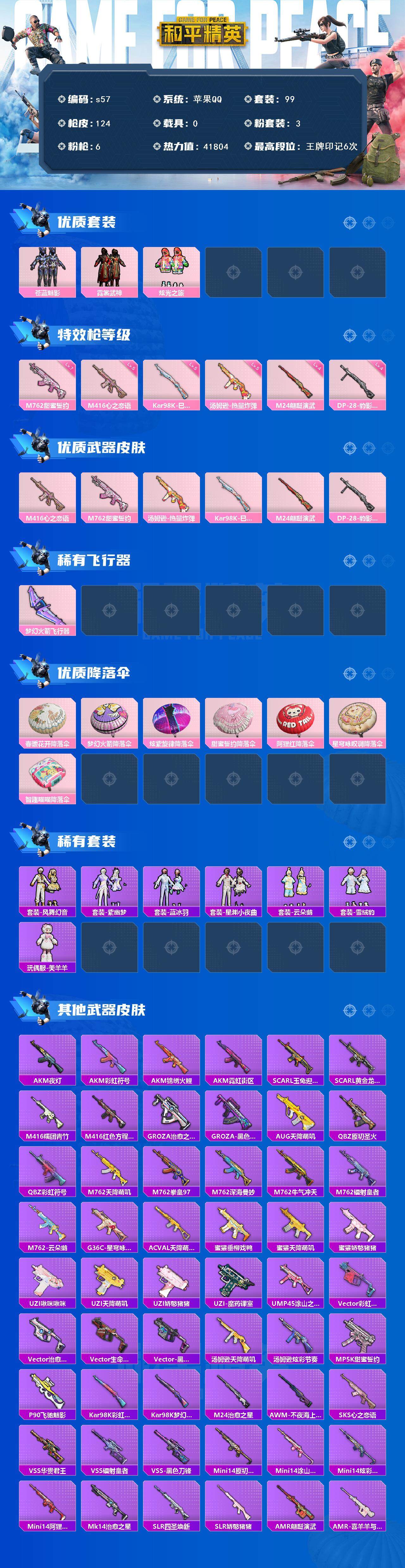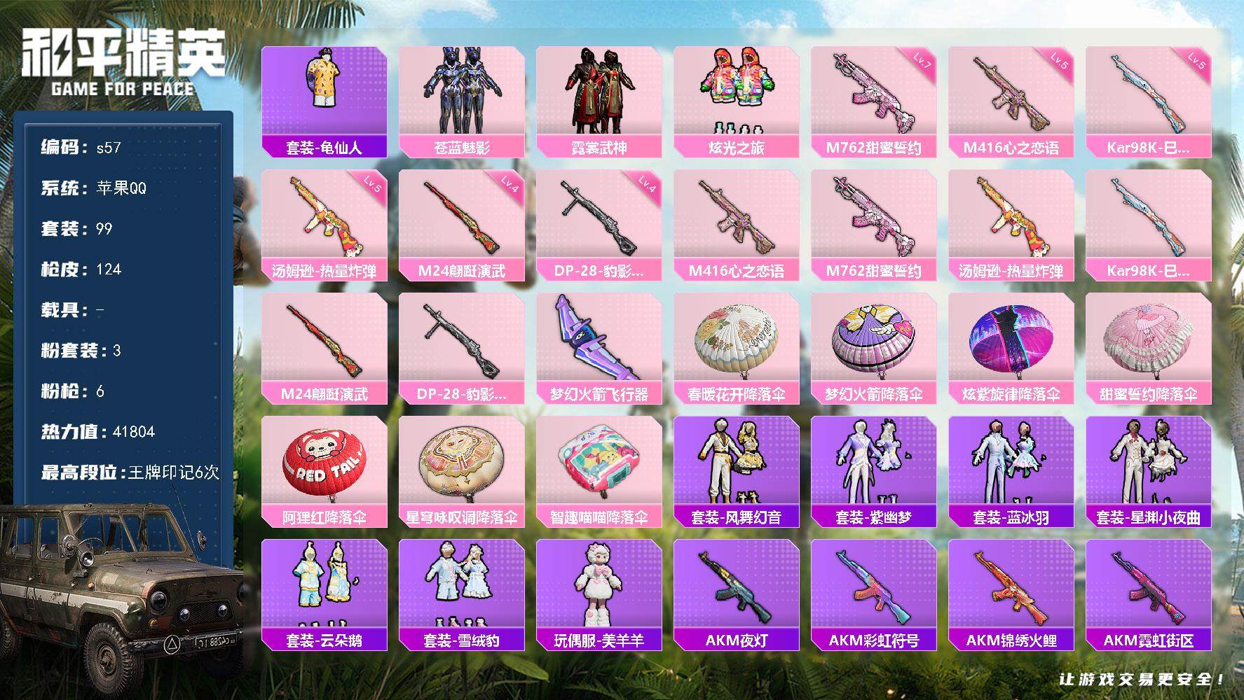 [13869376]苹果 手Q-3粉装-6特效枪-0载具-1粉色飞行器-41804热力值-6王牌印记-99套装-124枪皮 【热门品类】:套装-龟仙人 【粉色套装】:粉装-苍蓝魅影,粉装-霓裳武神,粉装-炫光之旅 【粉色枪皮等级】:M416-心之恋语(五级),M762-甜蜜誓约(七级),汤姆逊-热量炸弹(五级),Kar98K-巳巳如意(五级),M24-翩跹演武(四级),DP-28-豹影疾电(四级) 【粉色枪皮】:M416-心之恋语,M762-甜蜜誓约,汤姆逊-热量炸弹,Kar98K-巳巳如意,M24-翩跹演武,DP-28-豹影疾电 【粉色飞行器】:梦幻火箭飞行器 【粉色降落伞】:春暖花开降落伞,梦幻火箭降落伞,炫紫旋律降落伞,甜蜜誓约降落伞,阿狸红降落伞,星穹咏叹调降落伞,智趣喵喵降落伞 【稀有套装】:套装-龟仙人,套装-风舞幻音,套装-紫幽梦,套装-蓝冰羽,套装-星渊小夜曲,套装-云朵鹅,套装-雪绒豹,玩偶服-美羊羊 【稀有枪皮】:AKM-夜灯,AKM-彩虹符号,AKM-锦绣火鲤,AKM-霓虹街区,SCAR-L-玉兔迎春,SCAR-L-黄金龙骨,M416-糯团青竹,M416-红色方程式,GROZA-治愈之星,GROZA-黑色刀锋,AUG-天降萌叽,QBZ-原初圣火,QBZ-彩虹符号,M762-天降萌叽,M762-拳皇97,M762-深海曼妙,M762-牛气冲天,M762-镭射皇者,M762-云朵鹅,G36C-星穹咏叹调,AC-VAL-天降萌叽,蜜獾-垂柳戏鸭,蜜獾-天降萌叽,蜜獾-娇憨猪猪,UZI-啾咪啾咪,UZI-天降萌叽,UZI-娇憨猪猪,UZI-魔药课室,UMP45-涂山之恋,Vector-彩虹符号,Vector-治愈之星,Vector-生命誓言,Vector-黑色刀锋,汤姆逊-天降萌叽,汤姆逊-炫彩节奏,MP5K-甜蜜誓约,P90-飞驰魅影,Kar98K-彩虹符号,Kar98K-梦幻火箭,M24-治愈之星,AWM-不夜海上花,SKS-心之恋语,VSS-华贵君王,VSS-镭射皇者,VSS-黑色刀锋,Mini14-原初圣火,Mini14-涂山之恋,Mini14-炫彩节奏,Mini14-阿狸红,Mk14-治愈之星,SLR-四圣焕新,SLR-娇憨猪猪,AMR-翩跹演武,AMR-喜羊羊与灰太狼,SVD-云朵鹅,S686-深海曼妙,S686-生命誓言,S1897-炫彩节奏,S1897-