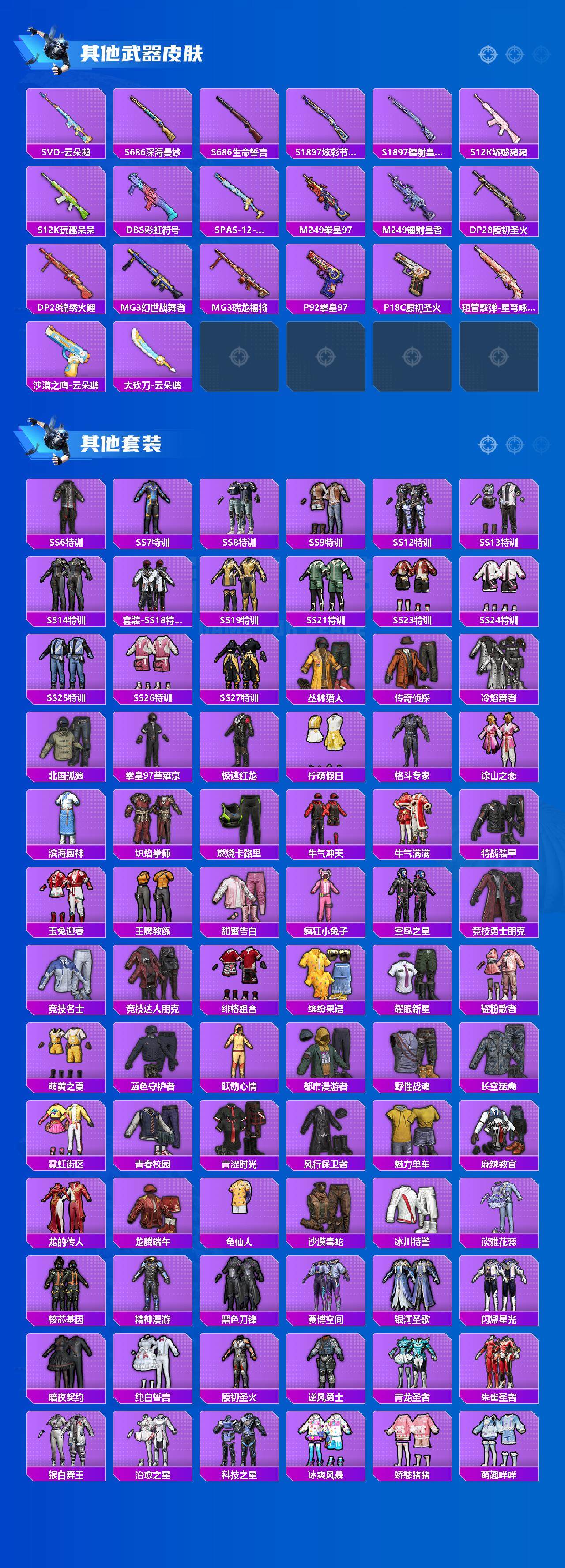 【稀有枪皮】:AKM-夜灯,AKM-彩虹符号,AKM-锦绣火鲤,AKM-霓虹街区,SCAR-L-玉兔迎春,SCAR-L-黄金龙骨,M416-糯团青竹,M416-红色方程式,GROZA-治愈之星,GROZA-黑色刀锋,AUG-天降萌叽,QBZ-原初圣火,QBZ-彩虹符号,M762-天降萌叽,M762-拳皇97,M762-深海曼妙,M762-牛气冲天,M762-镭射皇者,M762-云朵鹅,G36C-星穹咏叹调,AC-VAL-天降萌叽,蜜獾-垂柳戏鸭,蜜獾-天降萌叽,蜜獾-娇憨猪猪,UZI-啾咪啾咪,UZI-天降萌叽,UZI-娇憨猪猪,UZI-魔药课室,UMP45-涂山之恋,Vector-彩虹符号,Vector-治愈之星,Vector-生命誓言,Vector-黑色刀锋,汤姆逊-天降萌叽,汤姆逊-炫彩节奏,MP5K-甜蜜誓约,P90-飞驰魅影,Kar98K-彩虹符号,Kar98K-梦幻火箭,M24-治愈之星,AWM-不夜海上花,SKS-心之恋语,VSS-华贵君王,VSS-镭射皇者,VSS-黑色刀锋,Mini14-原初圣火,Mini14-涂山之恋,Mini14-炫彩节奏,Mini14-阿狸红,Mk14-治愈之星,SLR-四圣焕新,SLR-娇憨猪猪,AMR-翩跹演武,AMR-喜羊羊与灰太狼,SVD-云朵鹅,S686-深海曼妙,S686-生命誓言,S1897-炫彩节奏,S1897-