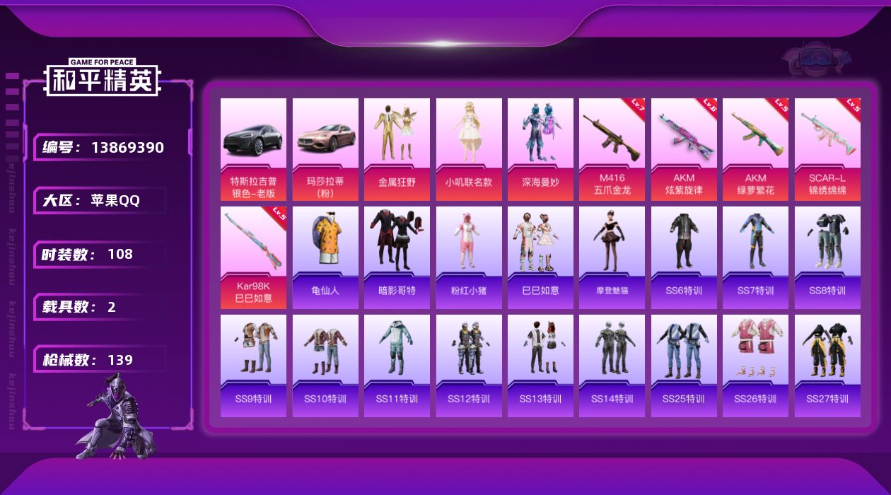 [13869390]苹果 手Q-3粉装-5特效枪-2载具-2粉色飞行器-49098热力值-7王牌印记-108套装-139枪皮