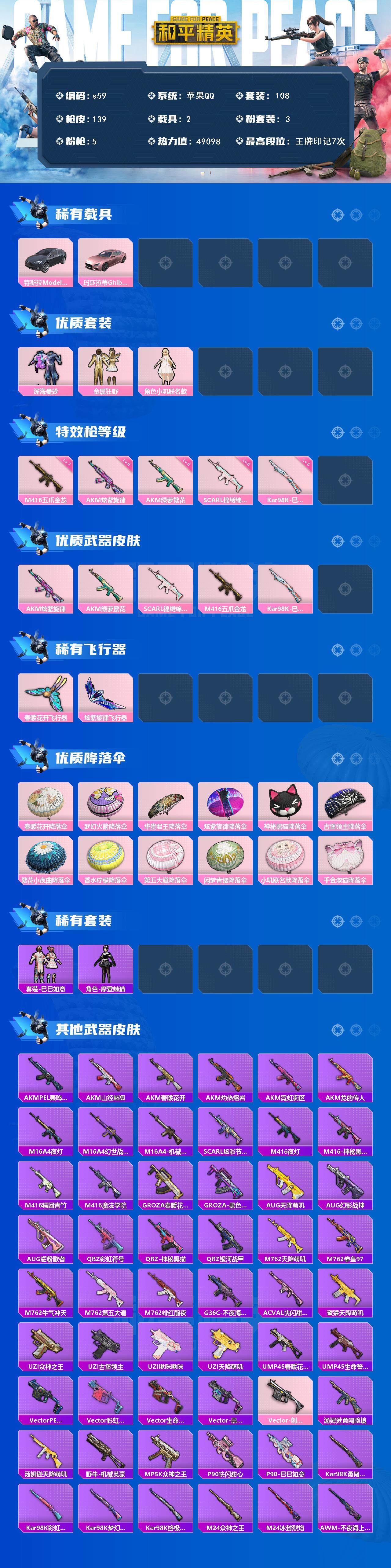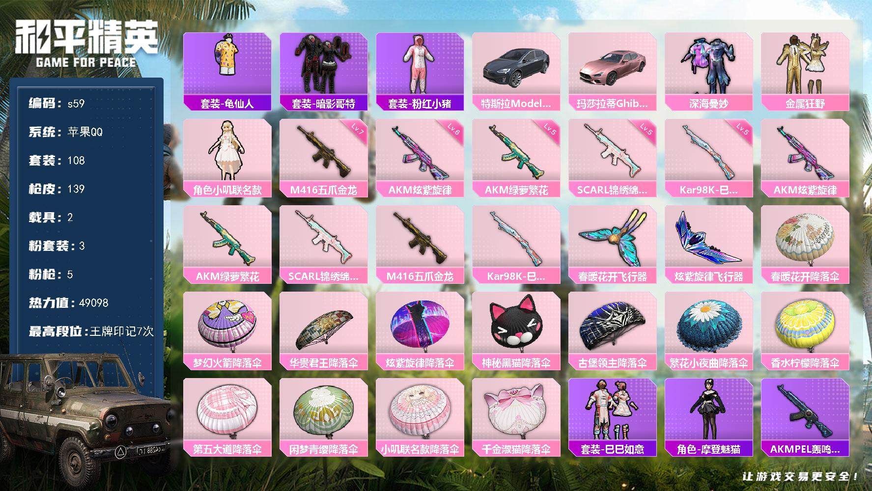 [13869390]苹果 手Q-3粉装-5特效枪-2载具-2粉色飞行器-49098热力值-7王牌印记-108套装-139枪皮 【热门品类】:套装-龟仙人,套装-暗影哥特,套装-粉红小猪 【粉色载具】:特斯拉Model X(冷光银),玛莎拉蒂Ghibli(粉) 【粉色套装】:粉装-深海曼妙,粉装-金属狂野,角色-小叽联名款 【粉色枪皮等级】:AKM-炫紫旋律(六级),AKM-绿萝繁花(五级),SCAR-L-锦绣绵绵(五级),M416-五爪金龙(七级),Kar98K-巳巳如意(五级) 【粉色枪皮】:AKM-炫紫旋律,AKM-绿萝繁花,SCAR-L-锦绣绵绵,M416-五爪金龙,Kar98K-巳巳如意 【粉色飞行器】:春暖花开飞行器,炫紫旋律飞行器 【粉色降落伞】:春暖花开降落伞,梦幻火箭降落伞,华贵君王降落伞,炫紫旋律降落伞,神秘黑猫降落伞,古堡领主降落伞,繁花小夜曲降落伞,香水柠檬降落伞,第五大道降落伞,闲梦青缨降落伞,小叽联名款降落伞,千金淑猫降落伞 【稀有套装】:套装-龟仙人,套装-巳巳如意,角色-摩登魅猫 【稀有枪皮】:AKM-PEL轰鸣竞梦者,AKM-山经魅狐,AKM-春暖花开,AKM-灼热熔岩,AKM-霓虹街区,AKM-龙的传人,M16A4-夜灯,M16A4-幻世战舞者,M16A4-机械英豪,SCAR-L-炫彩节奏,M416-夜灯,M416-神秘黑猫,M416-糯团青竹,M416-魔法学院,GROZA-春暖花开,GROZA-黑色刀锋,AUG-天降萌叽,AUG-幻影战神,AUG-耀粉歌者,QBZ-彩虹符号,QBZ-神秘黑猫,QBZ-银河战甲,M762-天降萌叽,M762-拳皇97,M762-牛气冲天,M762-第五大道,M762-绯红前夜,G36C-不夜海上花,AC-VAL-快闪甜心,蜜獾-天降萌叽,UZI-众神之王,UZI-古堡领主,UZI-啾咪啾咪,UZI-天降萌叽,UMP45-春暖花开,UMP45-生命誓言,Vector-PEL轰鸣竞梦者,Vector-彩虹符号,Vector-生命誓言,Vector-黑色刀锋,Vector-创世·救赎,汤姆逊-勇闯险境,汤姆逊-天降萌叽,野牛-机械英豪,MP5K-众神之王,P90-快闪甜心,P90-巳巳如意,Kar98K-勇闯险境,Kar98K-彩虹符号,Kar98K-梦幻火箭,Kar98K-终极赛罗,M24-众神之王,M24-冰封烈焰,