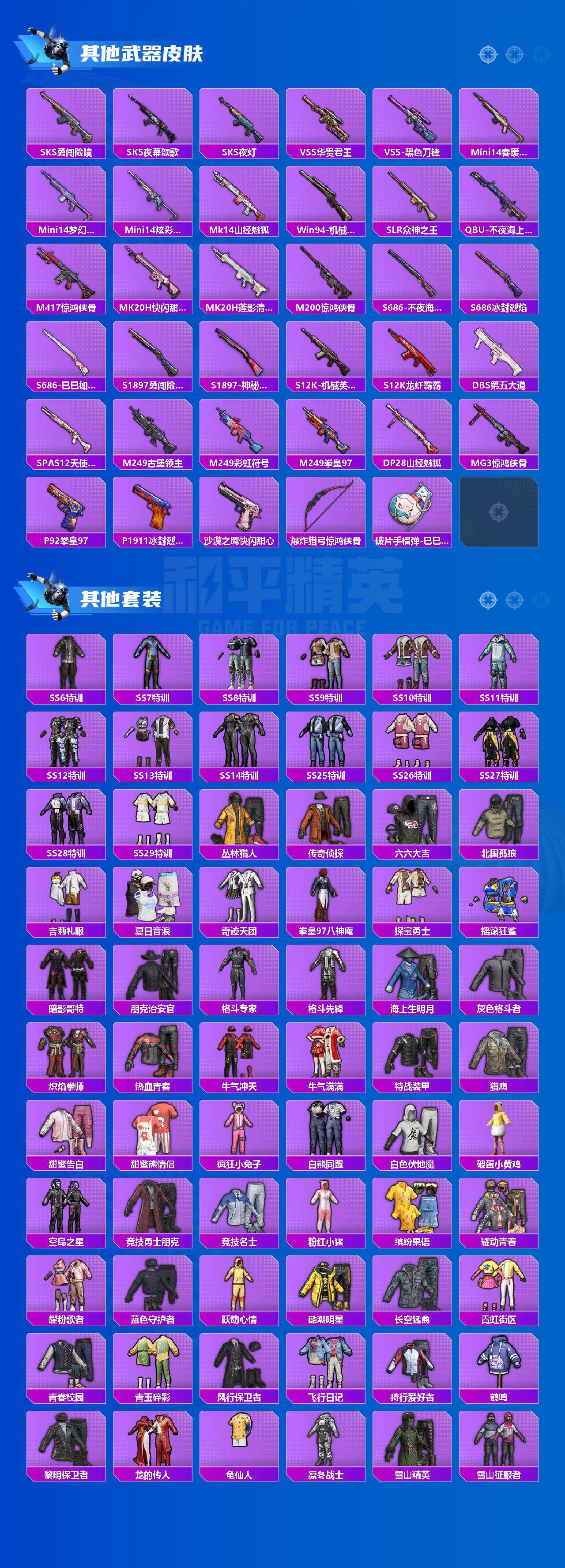 【稀有枪皮】:AKM-PEL轰鸣竞梦者,AKM-山经魅狐,AKM-春暖花开,AKM-灼热熔岩,AKM-霓虹街区,AKM-龙的传人,M16A4-夜灯,M16A4-幻世战舞者,M16A4-机械英豪,SCAR-L-炫彩节奏,M416-夜灯,M416-神秘黑猫,M416-糯团青竹,M416-魔法学院,GROZA-春暖花开,GROZA-黑色刀锋,AUG-天降萌叽,AUG-幻影战神,AUG-耀粉歌者,QBZ-彩虹符号,QBZ-神秘黑猫,QBZ-银河战甲,M762-天降萌叽,M762-拳皇97,M762-牛气冲天,M762-第五大道,M762-绯红前夜,G36C-不夜海上花,AC-VAL-快闪甜心,蜜獾-天降萌叽,UZI-众神之王,UZI-古堡领主,UZI-啾咪啾咪,UZI-天降萌叽,UMP45-春暖花开,UMP45-生命誓言,Vector-PEL轰鸣竞梦者,Vector-彩虹符号,Vector-生命誓言,Vector-黑色刀锋,Vector-创世·救赎,汤姆逊-勇闯险境,汤姆逊-天降萌叽,野牛-机械英豪,MP5K-众神之王,P90-快闪甜心,P90-巳巳如意,Kar98K-勇闯险境,Kar98K-彩虹符号,Kar98K-梦幻火箭,Kar98K-终极赛罗,M24-众神之王,M24-冰封烈焰,