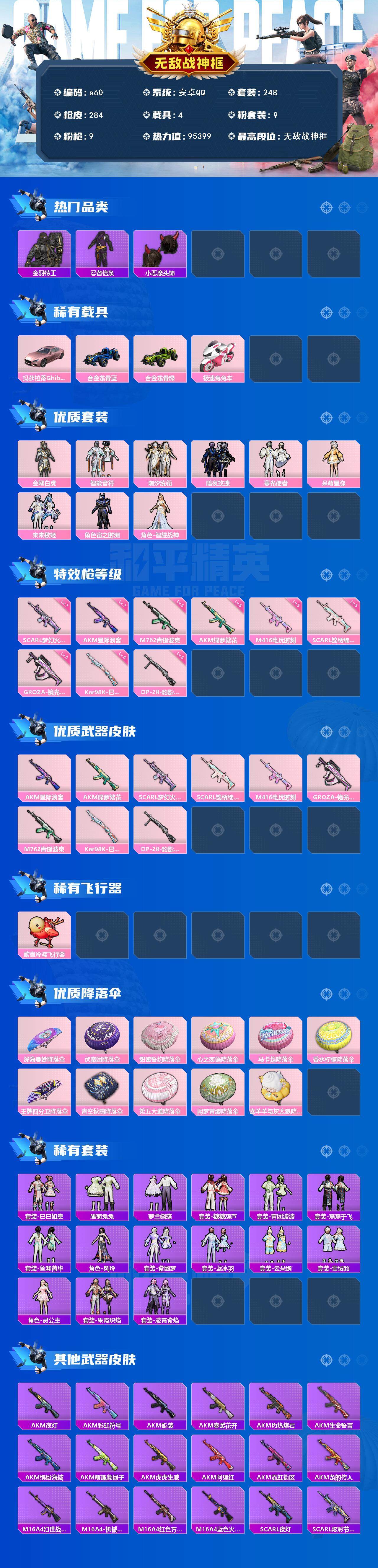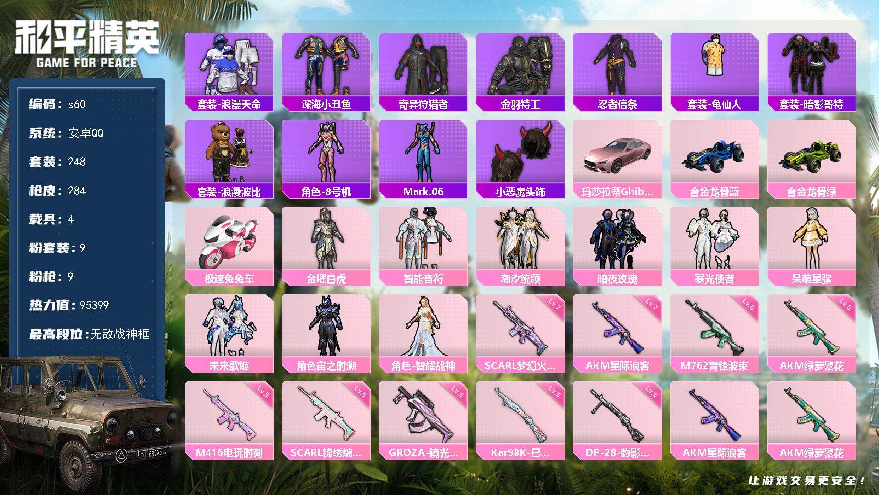 [13869398]安卓 手Q-无敌战神框-9粉装-9特效枪-4载具-1粉色飞行器-95399热力值-19王牌印记-248套装-284枪皮