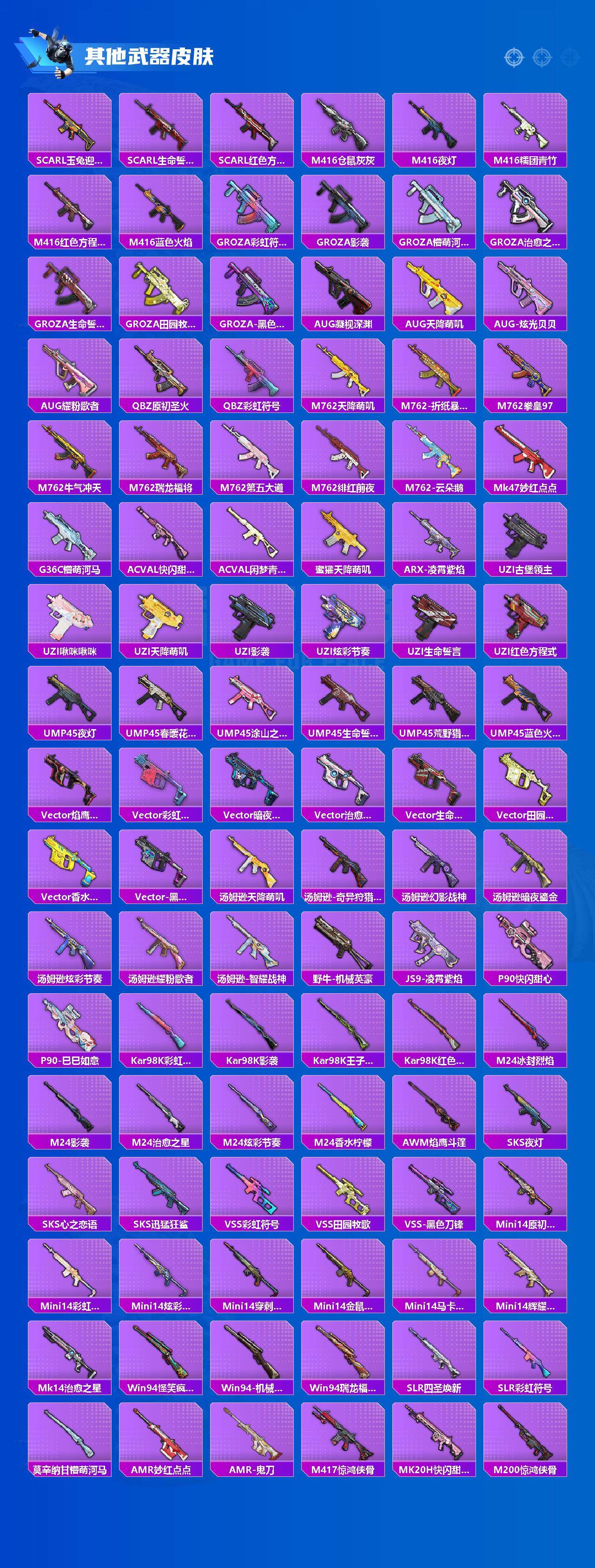 【稀有枪皮】:AKM-夜灯,AKM-彩虹符号,AKM-影袭,AKM-春暖花开,AKM-灼热熔岩,AKM-生命誓言,AKM-缤纷海域,AKM-萌趣颜团子,AKM-虎虎生威,AKM-阿狸红,AKM-霓虹街区,AKM-龙的传人,M16A4-幻世战舞者,M16A4-机械英豪,M16A4-红色方程式,M16A4-蓝色火焰,SCAR-L-夜灯,SCAR-L-炫彩节奏,SCAR-L-玉兔迎春,SCAR-L-生命誓言,SCAR-L-红色方程式,M416-仓鼠灰灰,M416-夜灯,M4