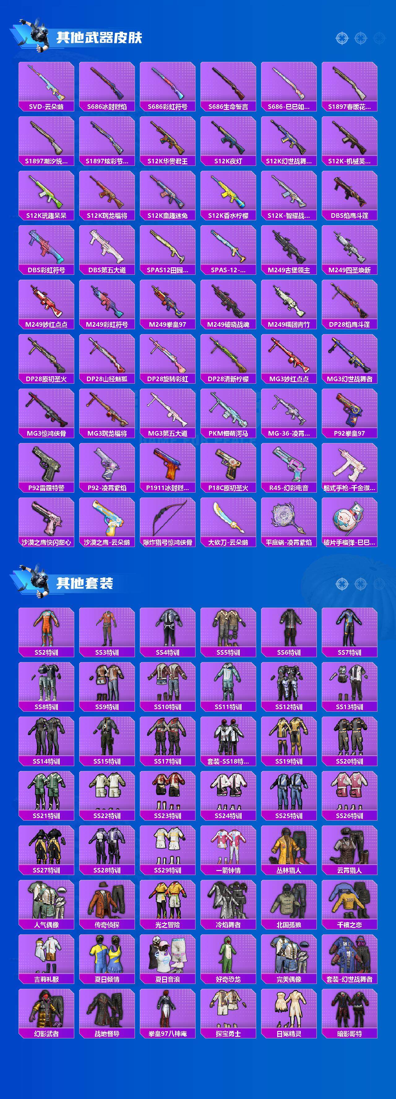 [13869398]安卓 手Q-无敌战神框-9粉装-9特效枪-4载具-1粉色飞行器-95399热力值-19王牌印记-248套装-284枪皮 【热门品类】:套装-浪漫天命,套装-深海小丑鱼,套装-奇异狩猎者,套装-金羽特工,套装-忍者信条,套装-龟仙人,套装-暗影哥特,套装-浪漫波比,角色-8号机,角色-Mark.06,小恶魔头饰 【粉色载具】:玛莎拉蒂Ghibli(粉),合金龙骨(蓝),合金龙骨(绿),极速兔兔车 【粉色套装】:粉装-金曜白虎,粉装-智能音符,粉装-潮汐统领,粉装-暗夜玫瑰,粉装-寒光使者,角色-呆萌星弥,粉装-未来歌姬,角色-宙之时溯,角色-智耀战神 【粉色枪皮等级】:AKM-星际浪客(七级),AKM-绿萝繁花(五级),SCAR-L-梦幻火箭(七级),SCAR-L-锦绣绵绵(五级),M416-电玩时刻(五级),GROZA-镜光银凌(五级),M762-青锋波束(五级),Kar98K-巳巳如意(五级),DP-28-豹影疾电(五级) 【粉色枪皮】:AKM-星际浪客,AKM-绿萝繁花,SCAR-L-梦幻火箭,SCAR-L-锦绣绵绵,M416-电玩时刻,GROZA-镜光银凌,M762-青锋波束,Kar98K-巳巳如意,DP-28-豹影疾电 【粉色飞行器】:歌者泠鸢飞行器 【粉色降落伞】:深海曼妙降落伞,伏魔团降落伞,甜蜜誓约降落伞,心之恋语降落伞,马卡龙降落伞,香水柠檬降落伞,王牌四分卫降落伞,青空秋雨降落伞,第五大道降落伞,闲梦青缨降落伞,喜羊羊与灰太狼降落伞 【稀有套装】:套装-龟仙人,套装-巳巳如意,套装-雏菊兔兔,套装-萝兰蝴蝶,套装-糖糖葫芦,套装-青团波波,套装-燕燕于飞,套装-鱼渊荷华,角色-风玲,套装-紫幽梦,套装-蓝冰羽,套装-云朵鹅,套装-雪绒豹,角色-灵公主,套装-朱霞炽焰,套装-凌霄紫焰 【稀有枪皮】:AKM-夜灯,AKM-彩虹符号,AKM-影袭,AKM-春暖花开,AKM-灼热熔岩,AKM-生命誓言,AKM-缤纷海域,AKM-萌趣颜团子,AKM-虎虎生威,AKM-阿狸红,AKM-霓虹街区,AKM-龙的传人,M16A4-幻世战舞者,M16A4-机械英豪,M16A4-红色方程式,M16A4-蓝色火焰,SCAR-L-夜灯,SCAR-L-炫彩节奏,SCAR-L-玉兔迎春,SCAR-L-生命誓言,SCAR-L-红色方程式,M416-仓鼠灰灰,M416-夜灯,M4