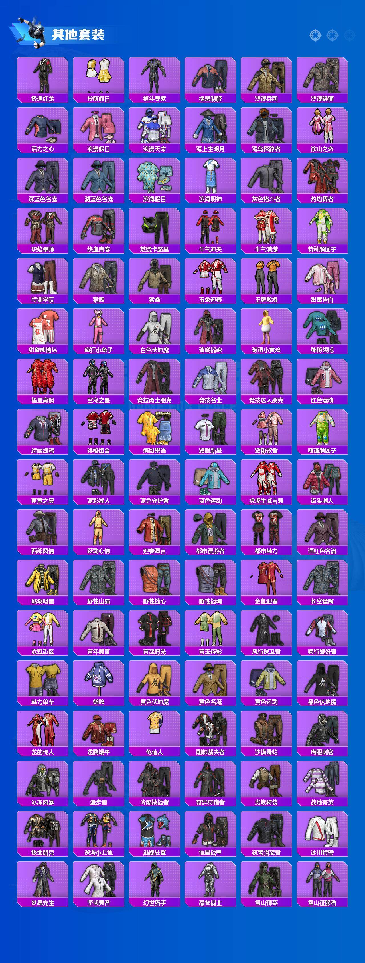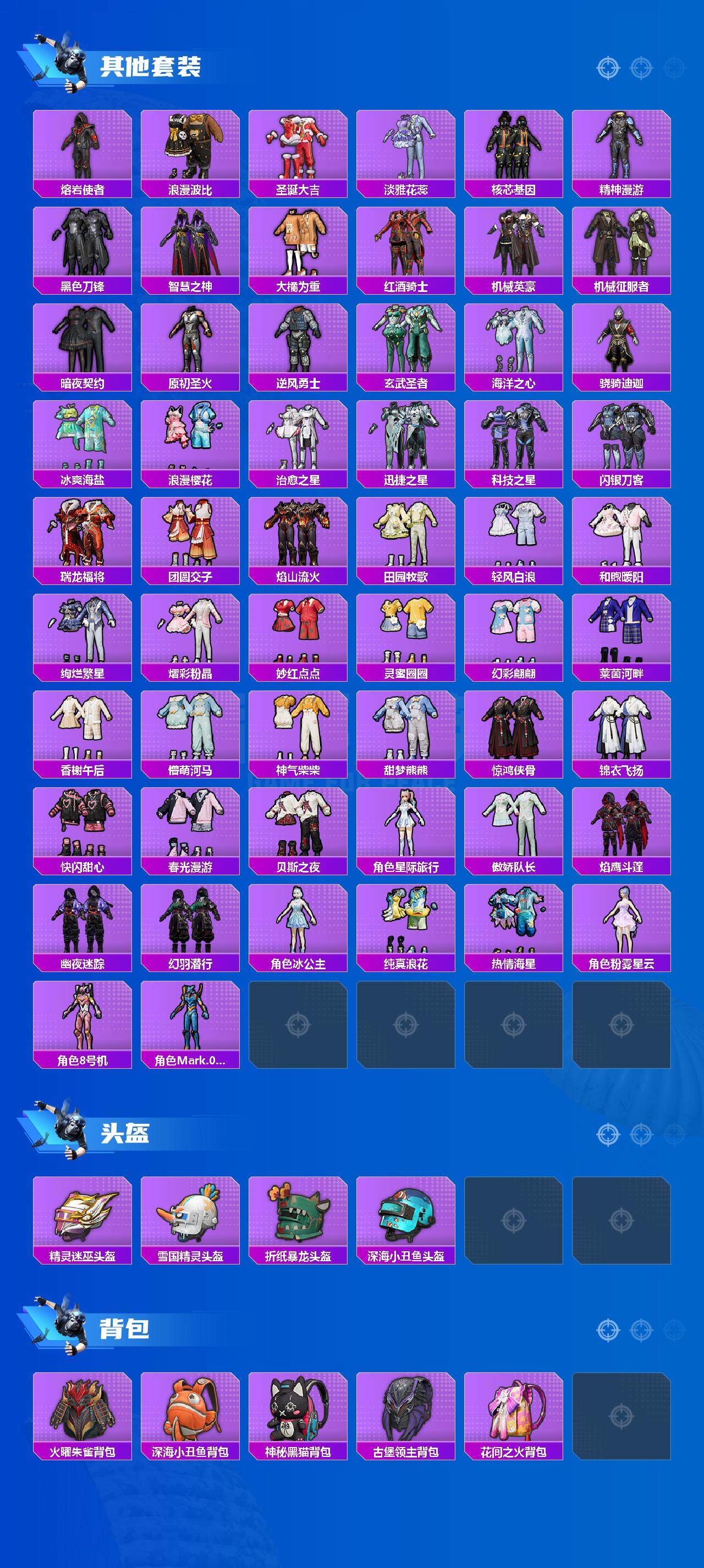 套装-浪漫天命,套装-金羽特工,忍者信条套装,套装-龟仙人,套装-暗影哥特,角色-8号机,角色-Mark.06,套装-极速红龙,套装-破蛋小黄鸡,套装-漫步者,套装-雪山精英,套装-黑色刀锋,套装-机械英豪,套装-暗夜契约,套装-玄武圣者,海洋之心套装,套装-冰爽海盐,套装-瑞龙福将,套装-团圆交子