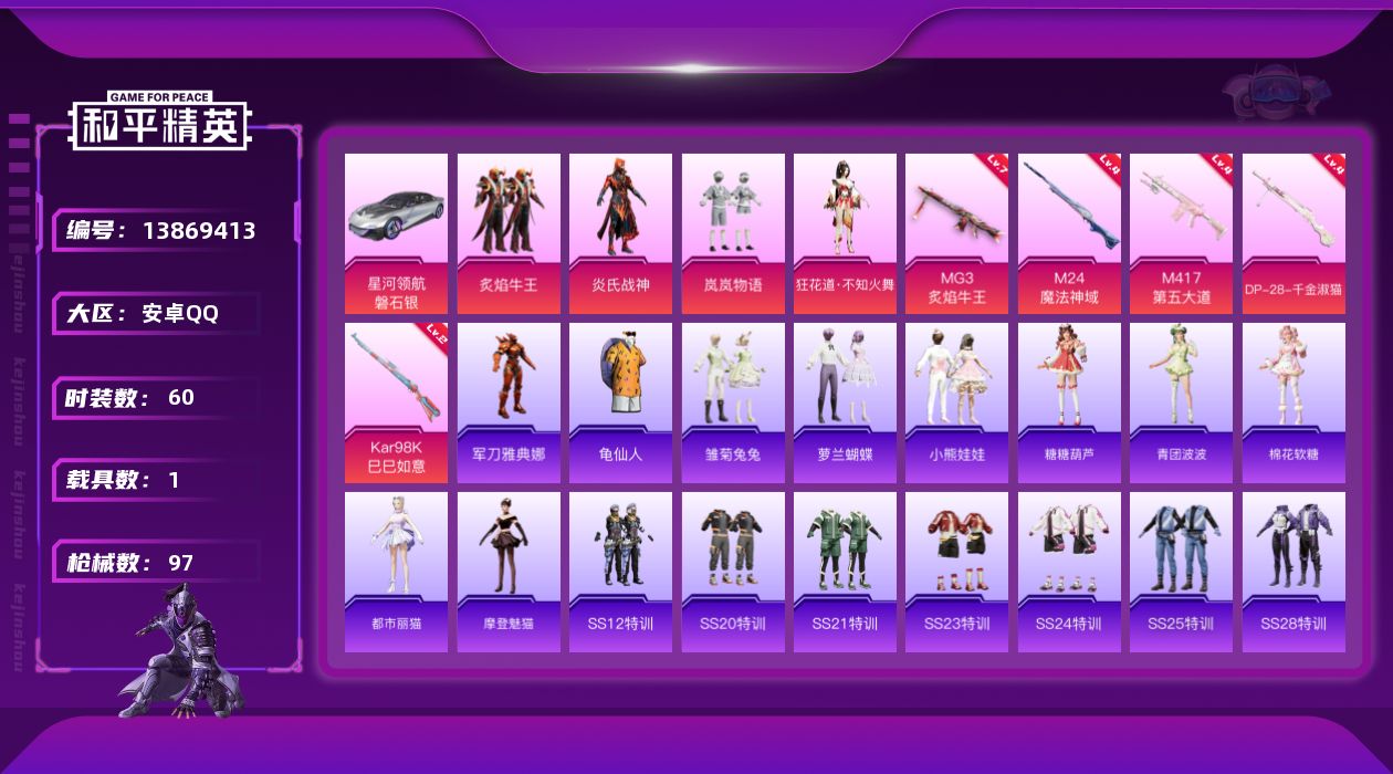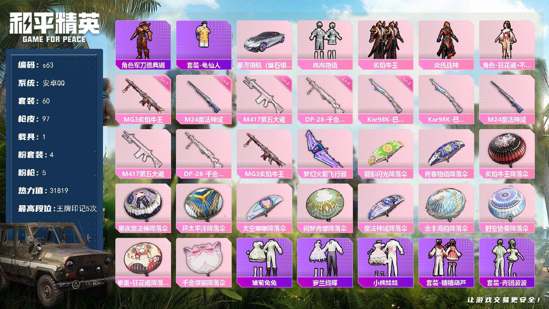 [13869413]安卓 手Q-4粉装-5特效枪-1载具-1粉色飞行器-31819热力值-5王牌印记-60套装-97枪皮