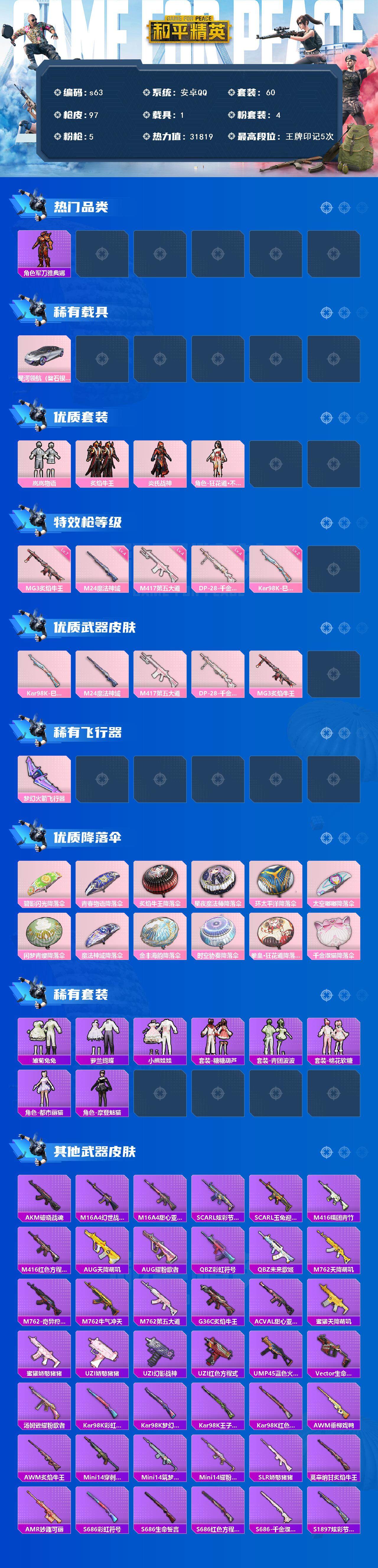 [13869413]安卓 手Q-4粉装-5特效枪-1载具-1粉色飞行器-31819热力值-5王牌印记-60套装-97枪皮 【热门品类】:角色-军刀雅典娜,套装-龟仙人 【粉色载具】:星河领航(磐石银) 【粉色套装】:粉装-岚岚物语,粉装-炙焰牛王,粉装-炎氏战神,角色-狂花道·不知火舞 【粉色枪皮等级】:Kar98K-巳巳如意(二级),M24-魔法神域(四级),M417-第五大道(四级),DP-28-千金淑猫(四级),MG3-炙焰牛王(七级) 【粉色枪皮】:Kar98K-巳巳如意,M24-魔法神域,M417-第五大道,DP-28-千金淑猫,MG3-炙焰牛王 【粉色飞行器】:梦幻火箭飞行器 【粉色降落伞】:碧影闪光降落伞,青春物语降落伞,炙焰牛王降落伞,星夜魔法师降落伞,环太平洋降落伞,太空嘟嘟降落伞,闲梦青缨降落伞,魔法神域降落伞,金丰海韵降落伞,时空协奏降落伞,拳皇·狂花道降落伞,千金淑猫降落伞 【稀有套装】:套装-龟仙人,套装-雏菊兔兔,套装-萝兰蝴蝶,套装-小熊娃娃,套装-糖糖葫芦,套装-青团波波,套装-棉花软糖,角色-都市丽猫,角色-摩登魅猫 【稀有枪皮】:AKM-破晓战魂,M16A4-幻世战舞者,M16A4-甜心亚梦,SCAR-L-炫彩节奏,SCAR-L-玉兔迎春,M416-糯团青竹,M416-红色方程式,AUG-天降萌叽,AUG-耀粉歌者,QBZ-彩虹符号,QBZ-未来歌姬,M762-天降萌叽,M762-奇异狩猎者,M762-牛气冲天,M762-第五大道,G36C-炙焰牛王,AC-VAL-甜心亚梦,蜜獾-天降萌叽,蜜獾-娇憨猪猪,UZI-娇憨猪猪,UZI-幻影战神,UZI-红色方程式,UMP45-蓝色火焰,Vector-生命誓言,汤姆逊-耀粉歌者,Kar98K-彩虹符号,Kar98K-梦幻火箭,Kar98K-王子的夏天,Kar98K-红色方程式,AWM-垂柳戏鸭,AWM-炙焰牛王,Mini14-穿刺龙虾,Mini14-筑梦精灵,Mini14-耀粉歌者,SLR-娇憨猪猪,莫辛纳甘-炙焰牛王,AMR-妙趣可丽,S686-彩虹符号,S686-生命誓言,S686-红色方程式,S686-千金淑猫,S1897-炫彩节奏,S12K-破晓战魂,S12K-娇憨猪猪,S12K-幻世战舞者,DBS-彩虹符号,DBS-甜心亚梦,M249-彩虹符号,M249-破晓战魂,DP-28-甜心亚梦,MG3