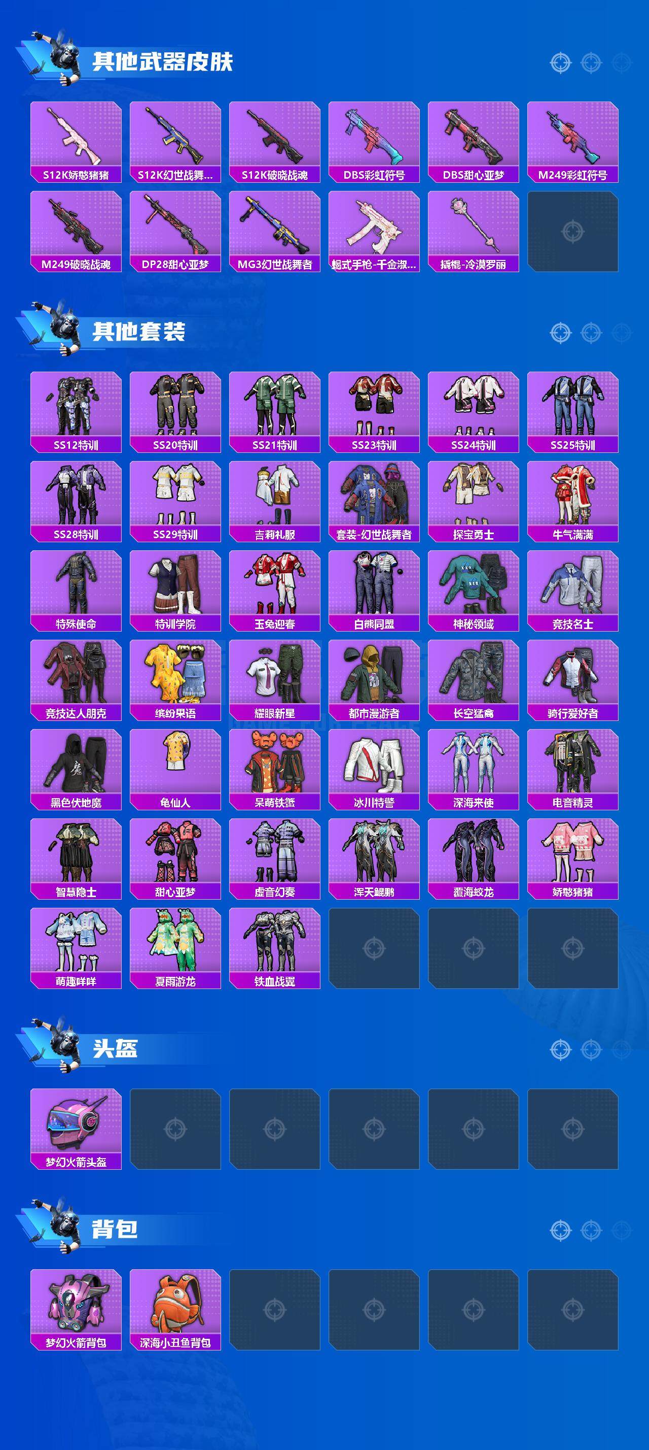 - [12234691]2粉装 6特效枪 5印记 可二次 可修改实名 身法装备:暗影哥特(红眼罩),Mark.06(新蓝螳螂) 优质装备:GROZA-镜光银凌,M762-鬼刀,AUG-暖羊咩咩,MK14-甜梦熊击,Kar98K-巳巳如意 热门装扮:电波星,光极星 稀有枪皮:DP-28-豹影疾电 五级特效枪:五级GROZA-镜光银凌,五级Kar98K-巳巳如意,五级MK14-甜梦熊击,五级M762-鬼刀,五级AUG-暖羊咩咩 四级特效枪:四级DP-28-豹影疾电 紫色装扮:SS30特训套装,SS31特训套装,SS33特训套装,青涩时光,香榭午后,魅力单车,冰河战士,香桃花海,霓虹街区,海岛探路者,暗黑骑手,极地朋克,血色贵族,缤纷果语,特殊使命,特训学院,猎鹰,萝兰蝴蝶,SS29特训,多纳泰罗,星途旅人,雏菊兔兔,热情海星,SS28特训,Mark.06(新蓝螳螂),鱼渊荷华,玉兔迎春,燕燕于飞,巳巳如意,智谋强哥,青团波波,糖糖葫芦,竞技名士,街头风暴,暗影哥特(红眼罩),纯真浪花,SS27特训,浪漫天命,SS26特训,春光漫游,快闪甜心,贝斯之夜,大橘大利,SS32特训服(SS32特训套装),蓝冰羽,紫幽梦,恋语绒绒 优质战备:圣堂之誓降落伞,精灵梦叶罗丽降落伞,星途旅人降落伞,忍者神龟降落伞,千金淑猫降落伞,繁龙极客降落伞,盛世惊鸿降落伞,临安公主降落伞,千面幻镜降落伞