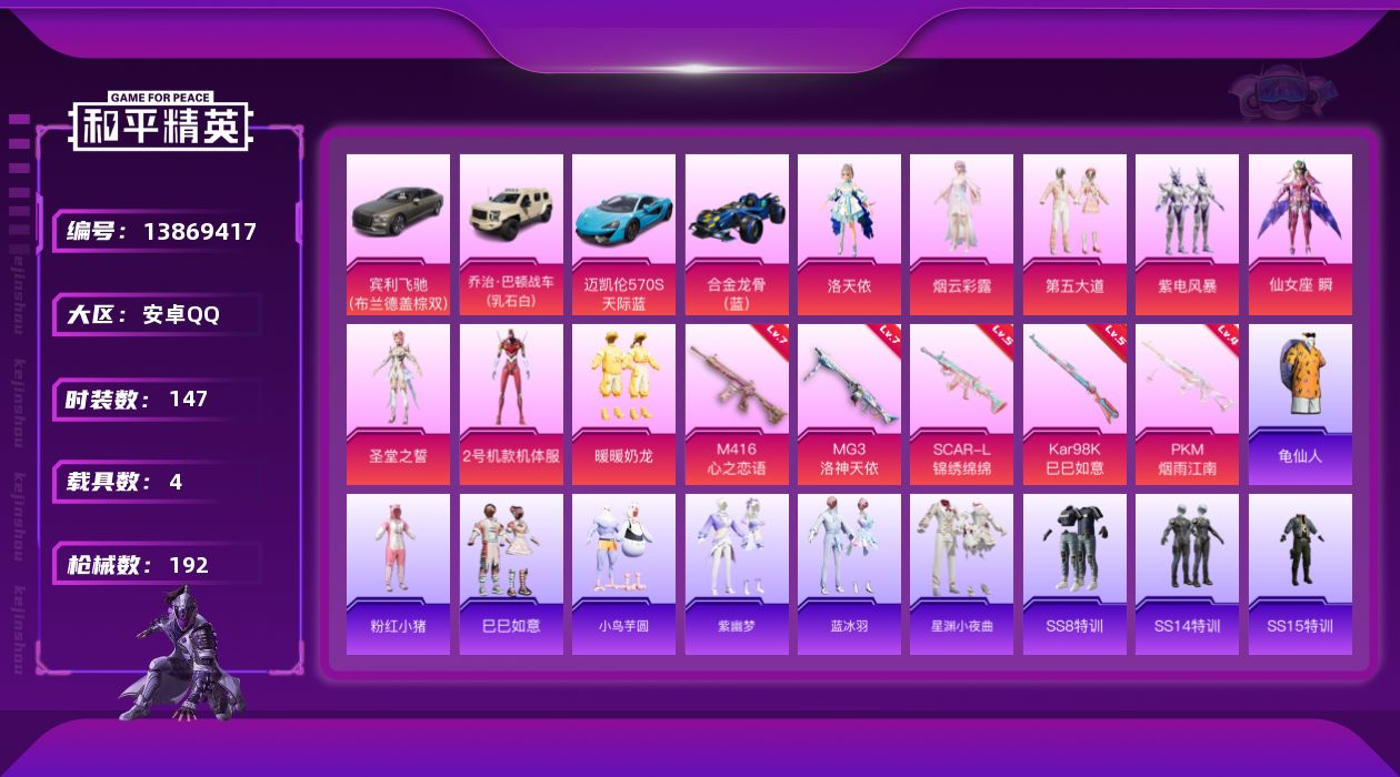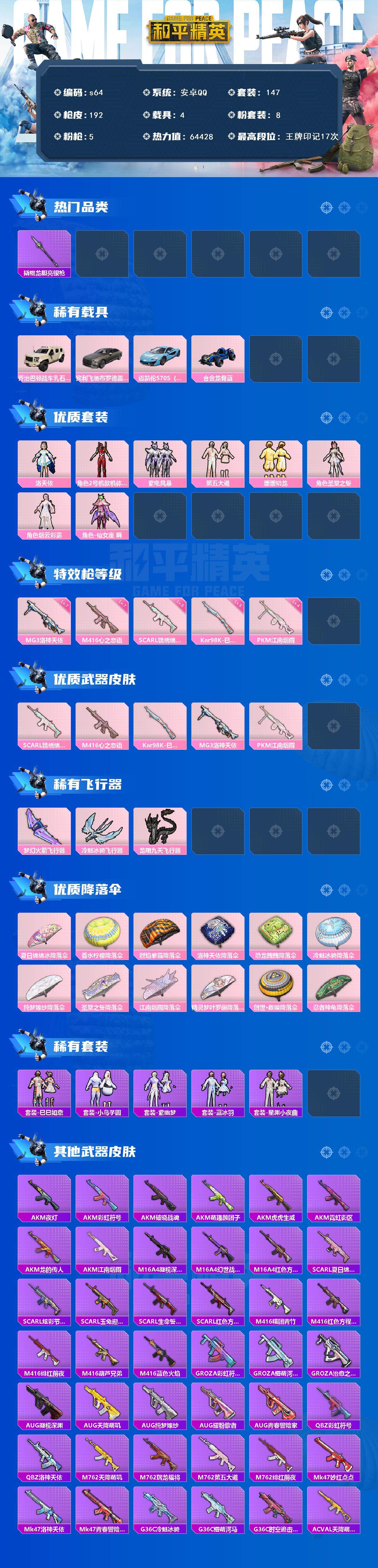 [13869417]安卓 手Q-8粉装-5特效枪-4载具-3粉色飞行器-64428热力值-17王牌印记-147套装-192枪皮 【热门品类】:套装-深海小丑鱼,套装-龟仙人,套装-粉红小猪,撬棍-龙胆亮银枪 【粉色载具】:乔治巴顿战车(乳石白),宾利飞驰(布罗德盖棕双色),迈凯伦570S(天际蓝),合金龙骨(蓝) 【粉色套装】:角色-洛天依,角色-2号机款机体服,粉装-紫电风暴,粉装-第五大道,粉装-暖暖奶龙,角色-圣堂之誓,角色-烟云彩露,角色-仙女座 瞬 【粉色枪皮等级】:SCAR-L-锦绣绵绵(五级),M416-心之恋语(七级),Kar98K-巳巳如意(五级),MG3-洛神天依(七级),PKM-江南烟雨(四级) 【粉色枪皮】:SCAR-L-锦绣绵绵,M416-心之恋语,Kar98K-巳巳如意,MG3-洛神天依,PKM-江南烟雨 【粉色飞行器】:梦幻火箭飞行器,冷魅冰骑飞行器,龙翔九天飞行器 【粉色降落伞】:夏日绵绵冰降落伞,香水柠檬降落伞,烈焰拳霸降落伞,洛神天依降落伞,恐龙拽拽降落伞,冷魅冰骑降落伞,纯梦嫁纱降落伞,圣堂之誓降落伞,江南烟雨降落伞,精灵梦叶罗丽降落伞,创世·救赎降落伞,忍者神龟降落伞 【稀有套装】:套装-龟仙人,套装-巳巳如意,套装-小鸟芋圆,套装-紫幽梦,套装-蓝冰羽,套装-星渊小夜曲 【稀有枪皮】:AKM-夜灯,AKM-彩虹符号,AKM-江南烟雨,AKM-破晓战魂,AKM-萌趣颜团子,AKM-虎虎生威,AKM-霓虹街区,AKM-龙的传人,M16A4-凝视深渊,M16A4-幻世战舞者,M16A4-红色方程式,SCAR-L-夏日绵绵冰,SCAR-L-炫彩节奏,SCAR-L-玉兔迎春,SCAR-L-生命誓言,SCAR-L-红色方程式,M416-糯团青竹,M416-红色方程式,M416-绯红前夜,M416-葫芦兄弟,M416-蓝色火焰,GROZA-彩虹符号,GROZA-懵萌河马,GROZA-治愈之星,AUG-凝视深渊,AUG-天降萌叽,AUG-纯梦嫁纱,AUG-耀粉歌者,AUG-青春冒险家,QBZ-彩虹符号,QBZ-洛神天依,M762-天降萌叽,M762-瑞龙福将,M762-第五大道,M762-绯红前夜,Mk47-妙红点点,Mk47-洛神天依,Mk47-青春冒险家,G36C-冷魅冰骑,G36C-懵萌河马,G36C-时空追击者,AC-VAL-天降萌叽,AC-VAL-