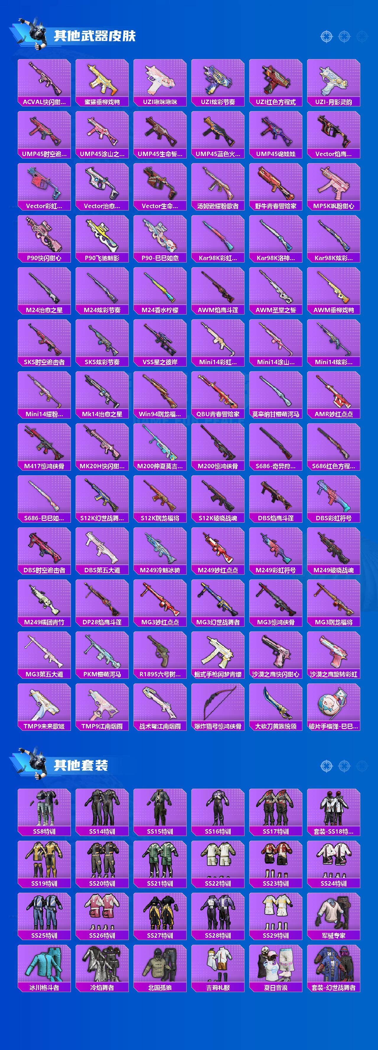 【稀有枪皮】:AKM-夜灯,AKM-彩虹符号,AKM-江南烟雨,AKM-破晓战魂,AKM-萌趣颜团子,AKM-虎虎生威,AKM-霓虹街区,AKM-龙的传人,M16A4-凝视深渊,M16A4-幻世战舞者,M16A4-红色方程式,SCAR-L-夏日绵绵冰,SCAR-L-炫彩节奏,SCAR-L-玉兔迎春,SCAR-L-生命誓言,SCAR-L-红色方程式,M416-糯团青竹,M416-红色方程式,M416-绯红前夜,M416-葫芦兄弟,M416-蓝色火焰,GROZA-彩虹符号,GROZA-懵萌河马,GROZA-治愈之星,AUG-凝视深渊,AUG-天降萌叽,AUG-纯梦嫁纱,AUG-耀粉歌者,AUG-青春冒险家,QBZ-彩虹符号,QBZ-洛神天依,M762-天降萌叽,M762-瑞龙福将,M762-第五大道,M762-绯红前夜,Mk47-妙红点点,Mk47-洛神天依,Mk47-青春冒险家,G36C-冷魅冰骑,G36C-懵萌河马,G36C-时空追击者,AC-VAL-天降萌叽,AC-VAL-